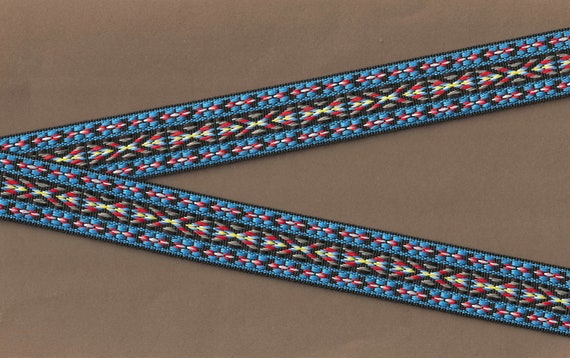 NATIVE AMERICAN F-30-B Jacquard Ribbon Poly Trim 1" wide (25mm) REVERSIBLE White w/Blue, Gray, Red & Yellow Accents