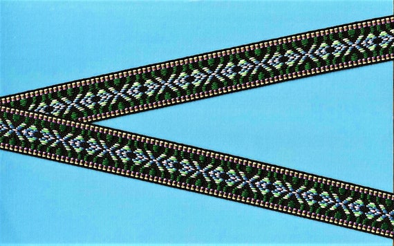 GEOMETRIC B-24-C Jacquard Ribbon Polyester Trim 9/16" wide (14mm) Black w/Mustard Gold Borders, Brown, Orange, Lilac, Blue, Green Motif