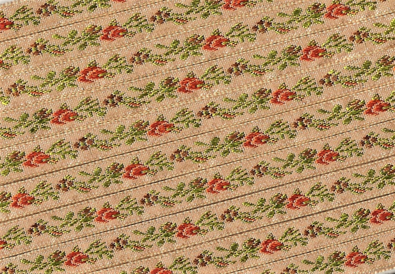 Jacquard Ribbon Trim - named for the man who invented the loom on which this trim is made - Joseph Marie Jacquard (France 1732-1854). Jacquard trims nowadays are woven using many different materials including rayon, polyester, metallic, cotton, blends and on rare occasion silk. Unless otherwise noted these trims are all cold water machine wash/dry and are colorfast. Please use your own judgment.