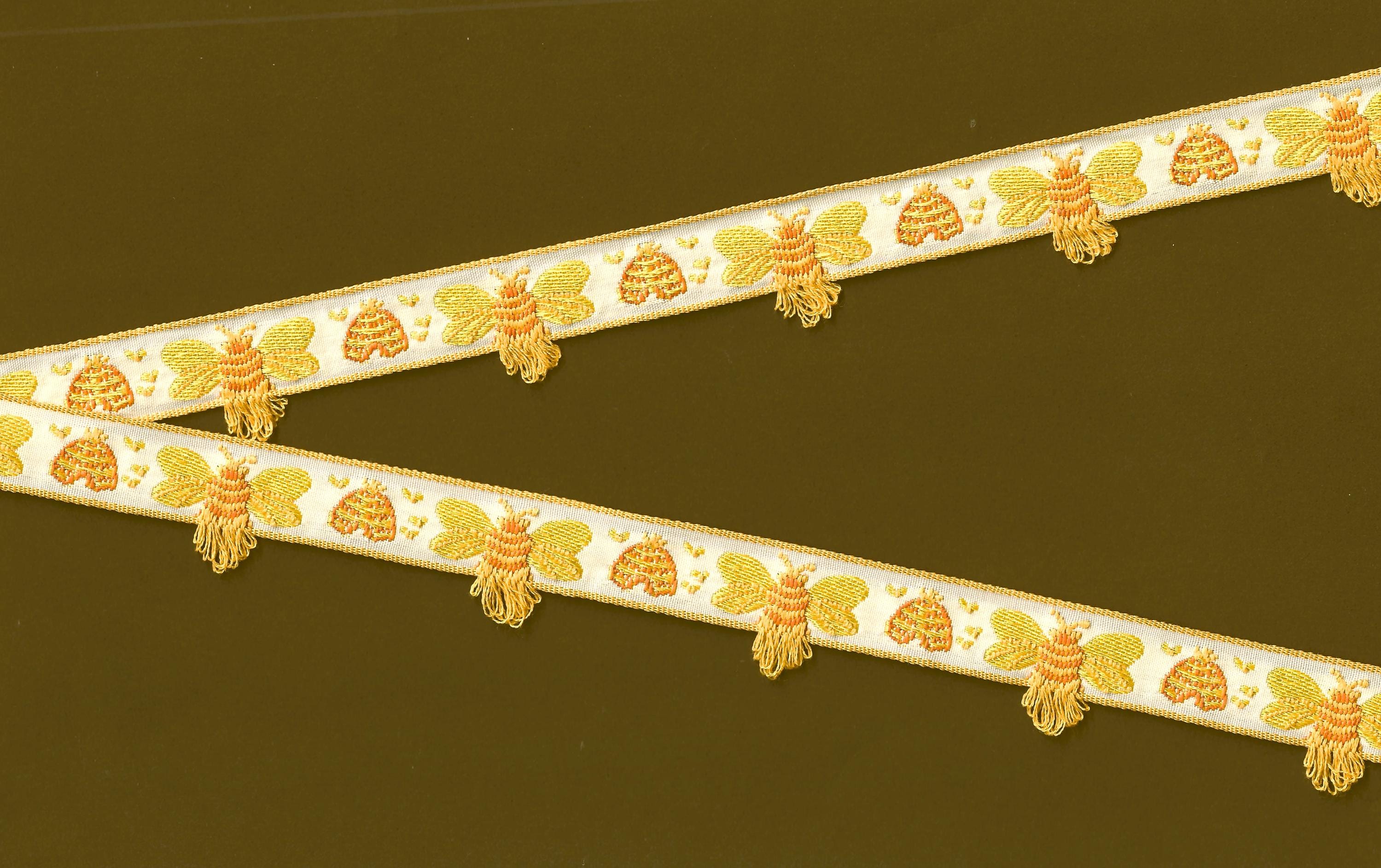 5/8" wide (16mm cotton France) White w/Yellow & Orange Bees (and fringe accent)