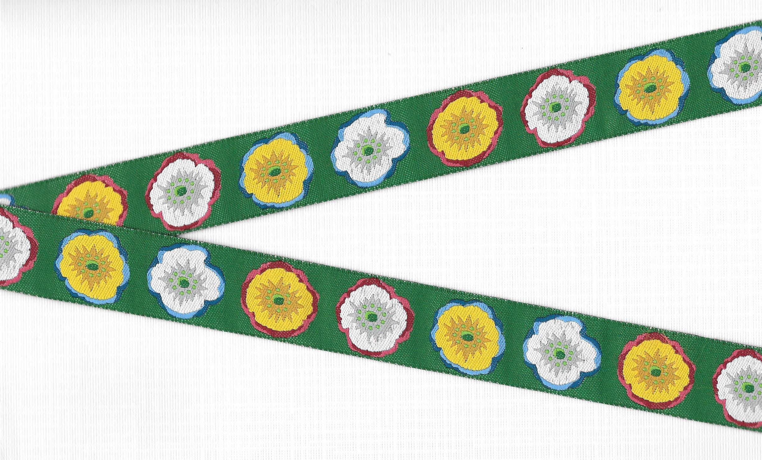 7/8" wide (22mm) poly Green w/White & Yellow Pansies,