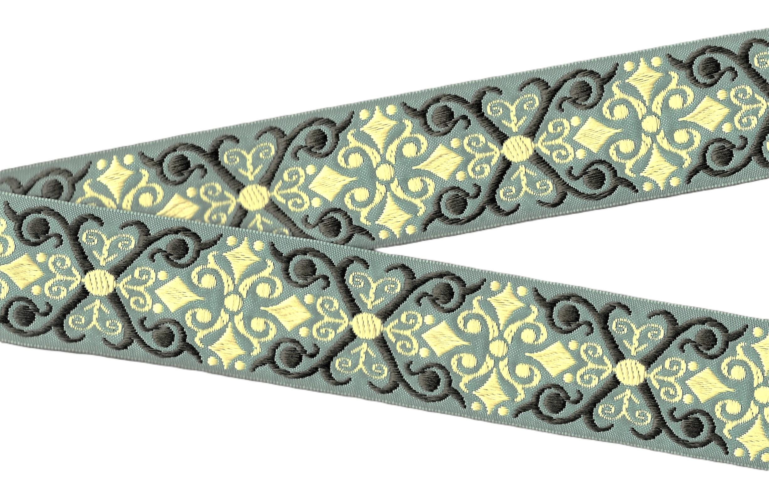 Jacquard Ribbon Trim - named for the man who invented the loom on which this trim is made - Joseph Marie Jacquard (France 1732-1854). Jacquard trims nowadays are woven using many different materials including rayon, polyester, metallic, cotton, blends and on rare occasion silk. Unless otherwise noted these trims are all cold water machine wash/dry and are colorfast. Please use your own judgment.