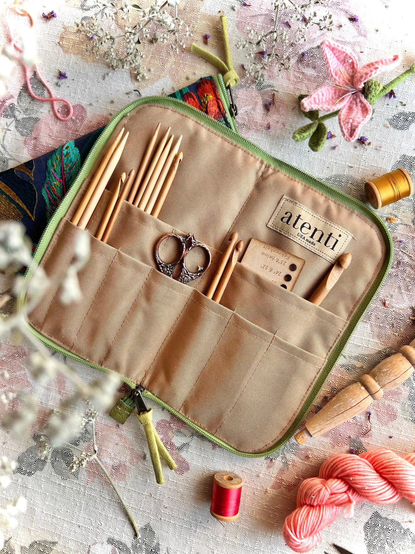 Needles Hooks & Tool Case Dimensions: 9" x 5" (closed) Organizer has 11 different size slots for holding needles/crochet hooks up to 8.5" long inside a zippered case. Fabric layout may differ from actual picture.
