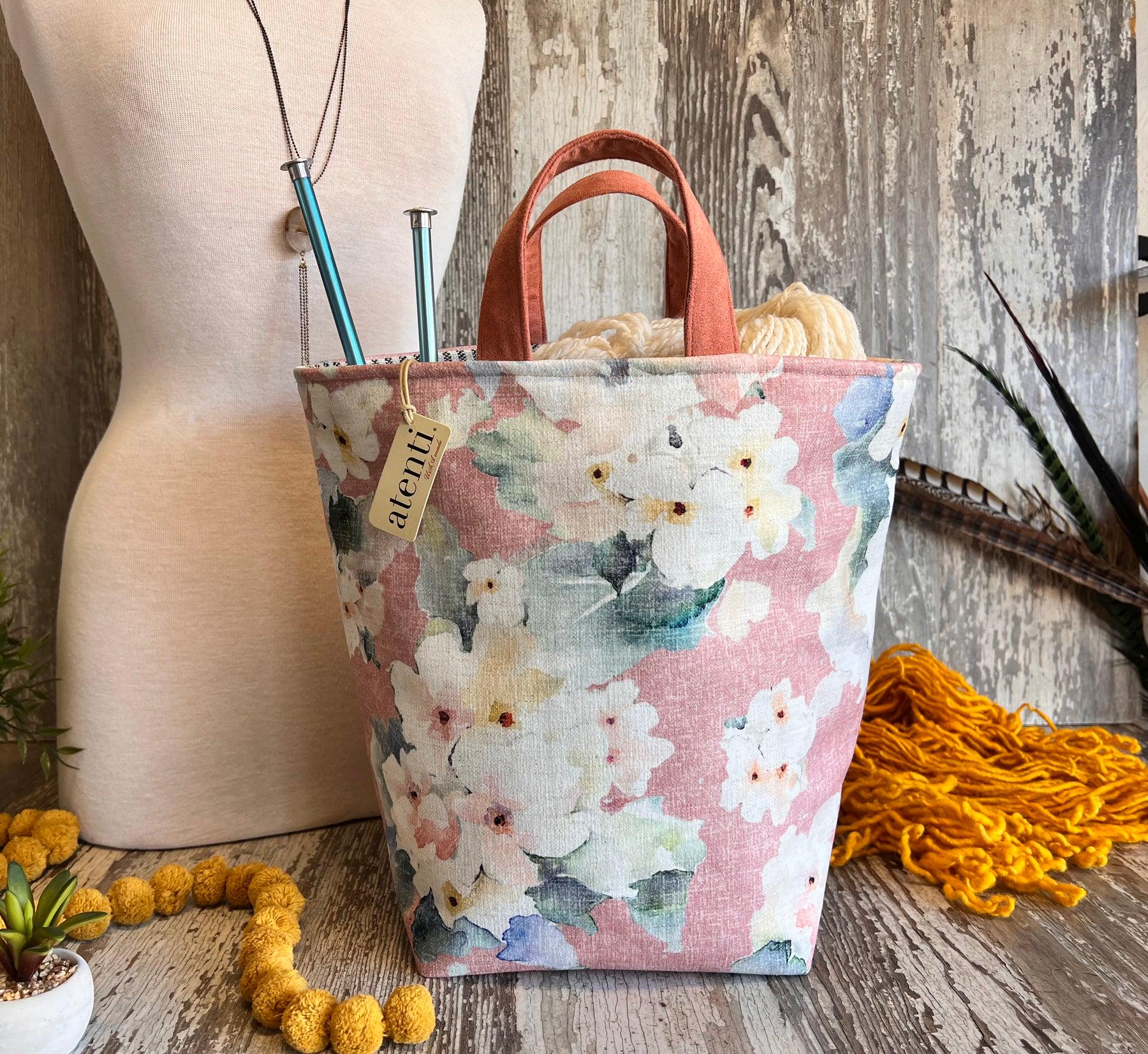 The Hope Bucket organizer: A roomy stand-alone project bag. Top rolls down for easy access. Wide opening and two handles. Fully lined in water our light tan water repellent taffeta. Inside are three pockets.