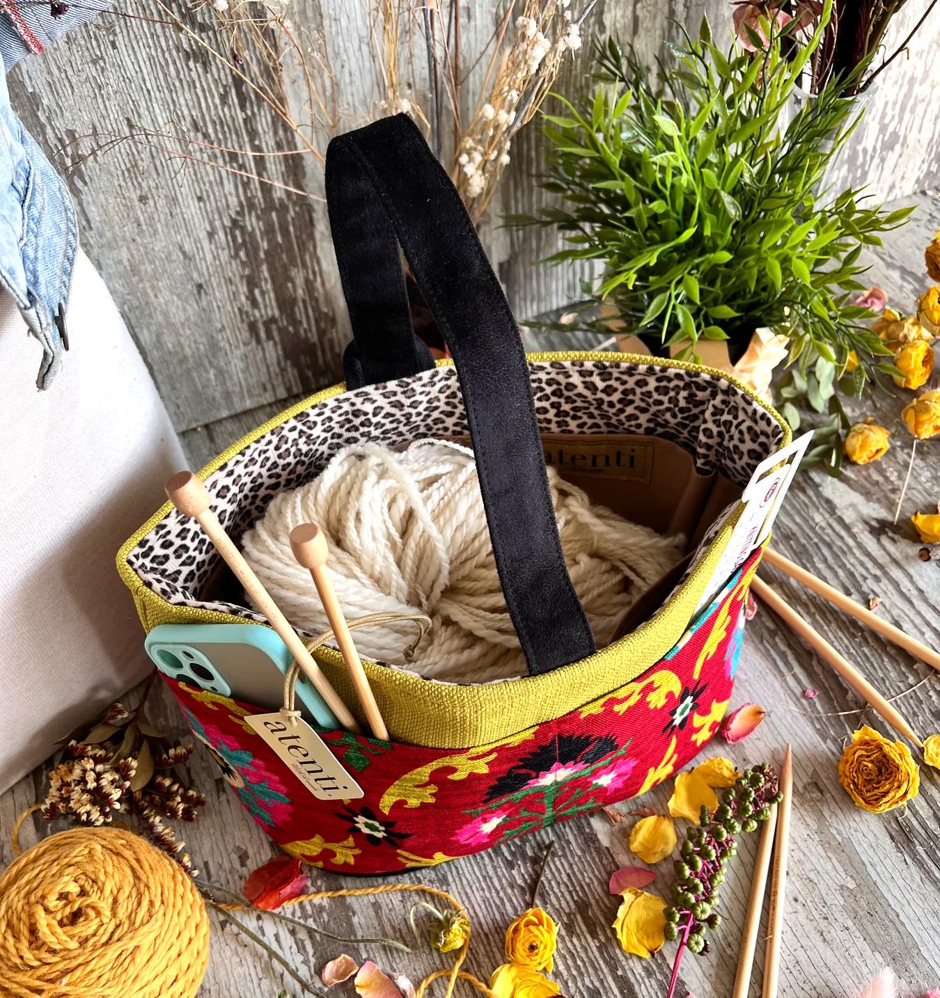 The small bucket organizer is great to store and keep handy all your tools and notions. This bag handles smaller projects like hats, socks, scarves or baby/children's clothing. Fully lined in a water resistant taffeta and has an ample center section. Four outside/four inside pockets keep smaller items separate. An ultra suede handle with a secure loop (for closing).