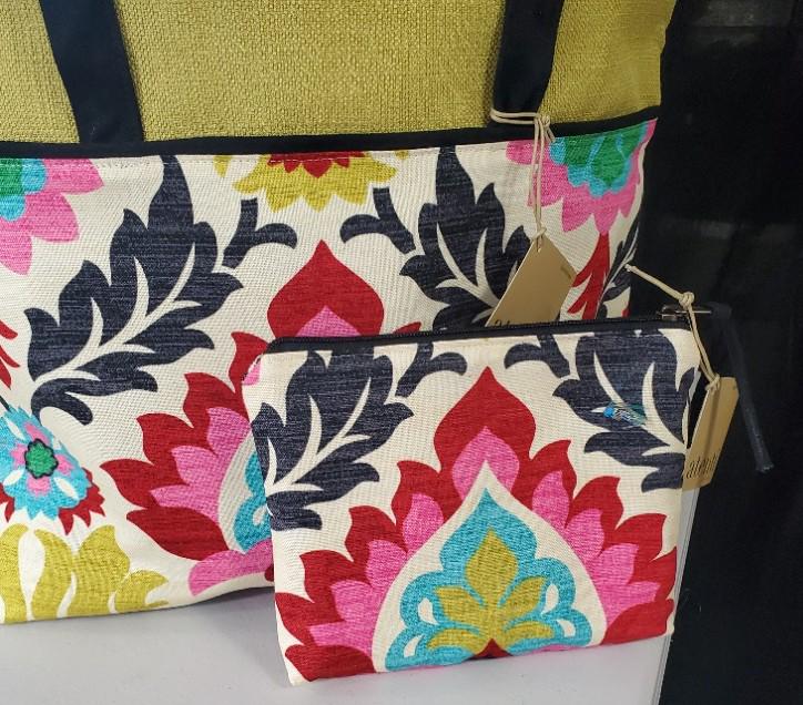 "SANTA MARIA" pattern - a multi-colored bright, bold floral with an avocado lining. Coordinating fabrics in gray/cream Cheetah, avocado linen and black ultra suede straps.
