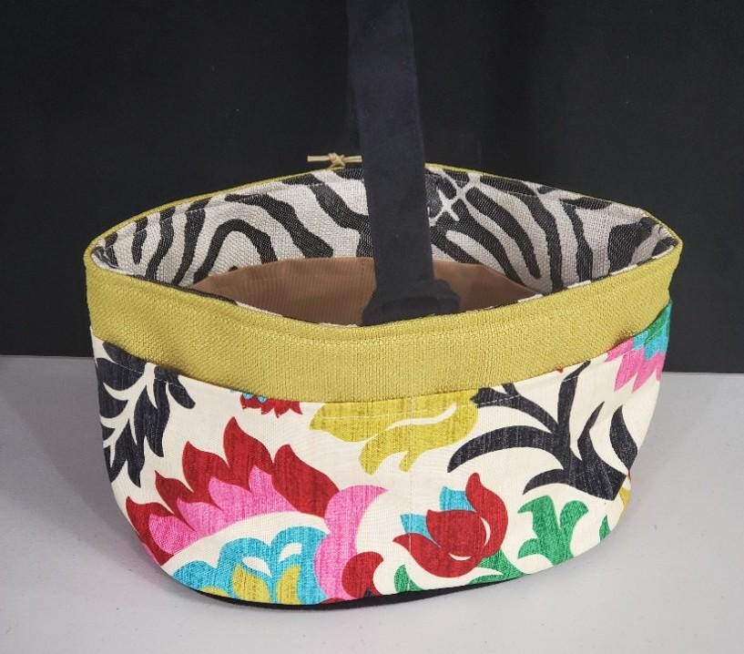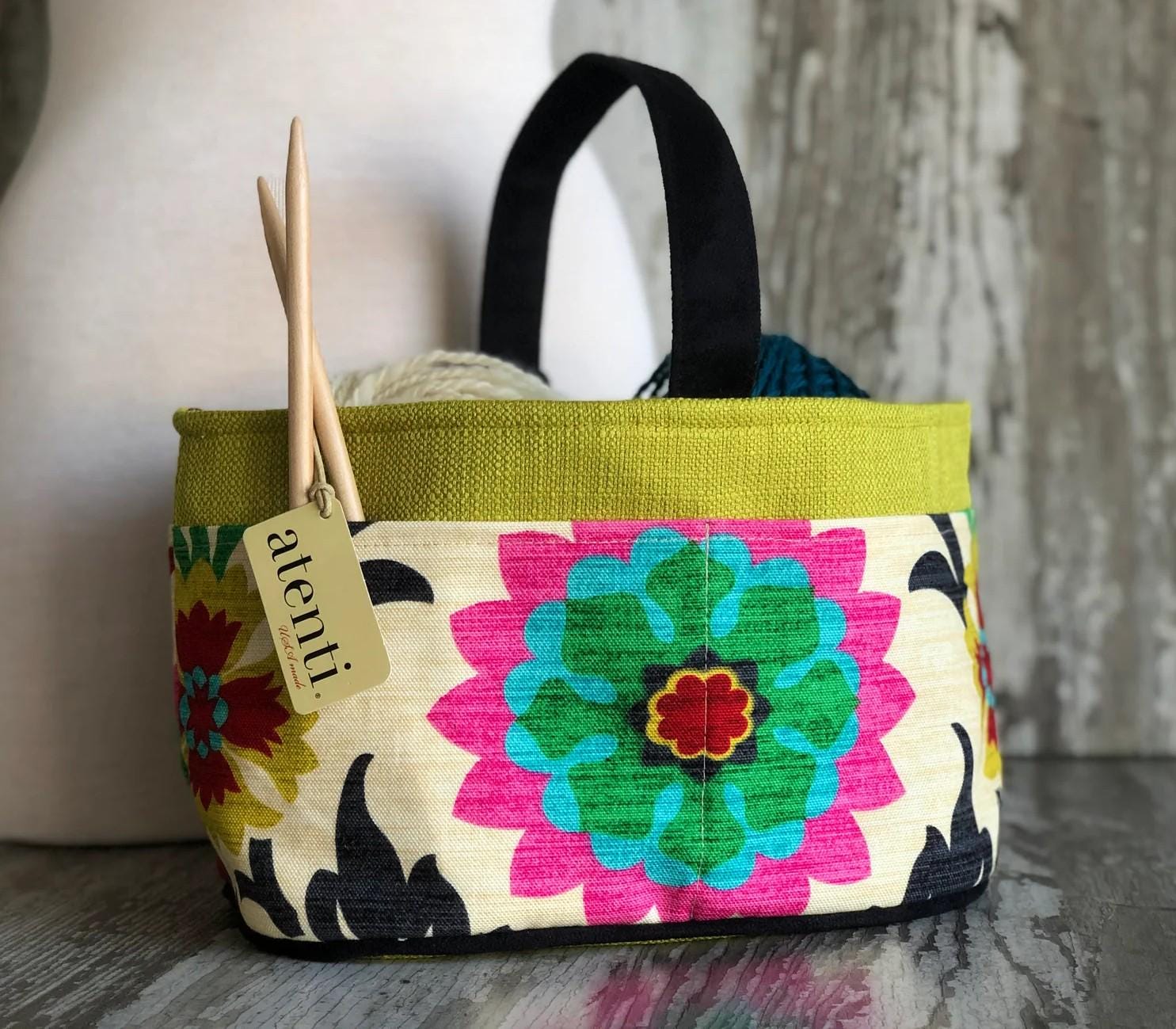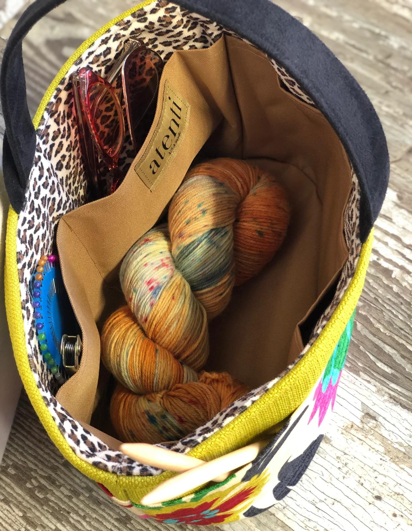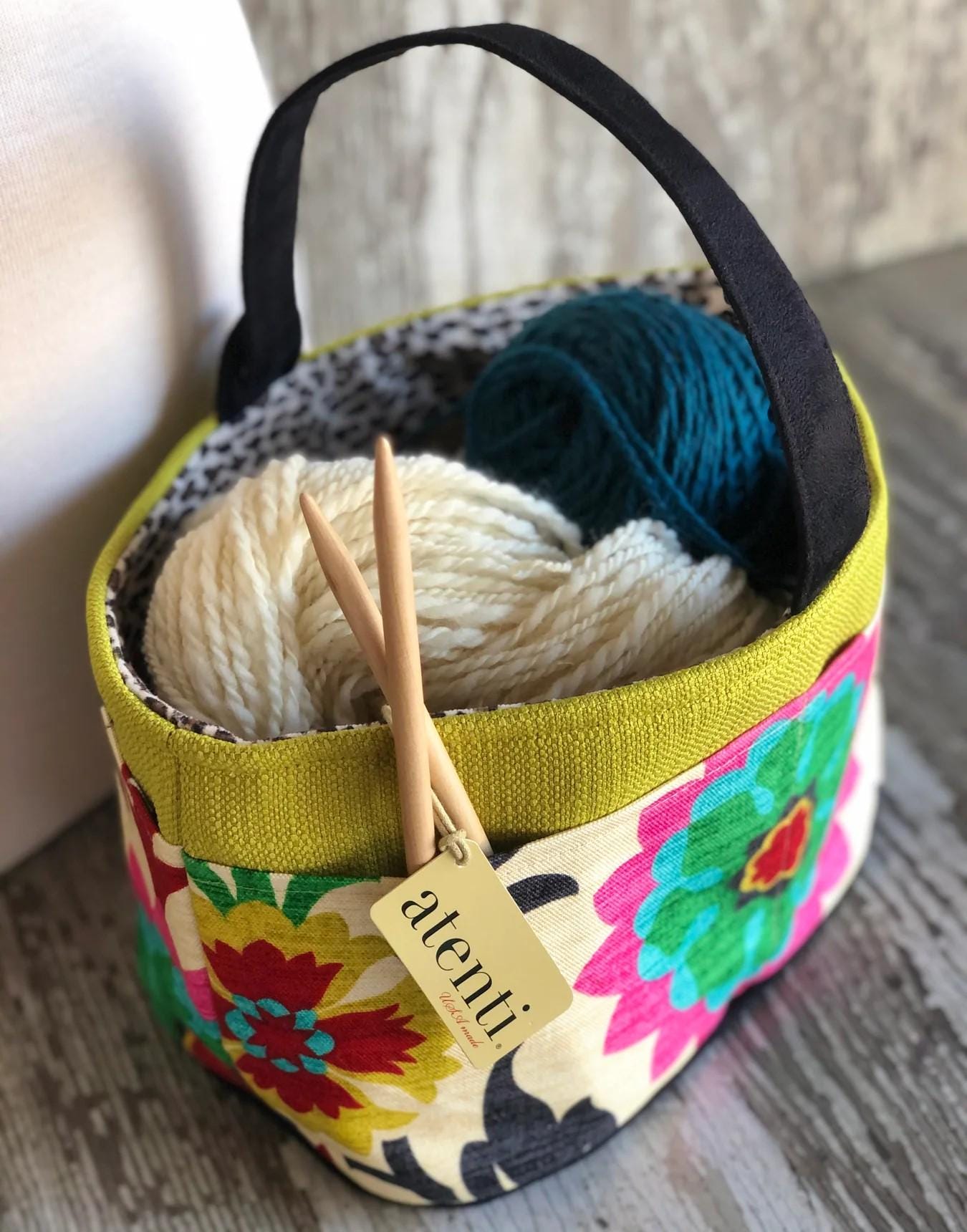 The small bucket organizer is great to store and keep handy all your tools and notions. This bag handles smaller projects like hats, socks, scarves or baby/children's clothing. Fully lined in a water resistant taffeta and has an ample center section. Four outside/four inside pockets keep smaller items separate. An ultra suede handle with a secure loop (for closing).