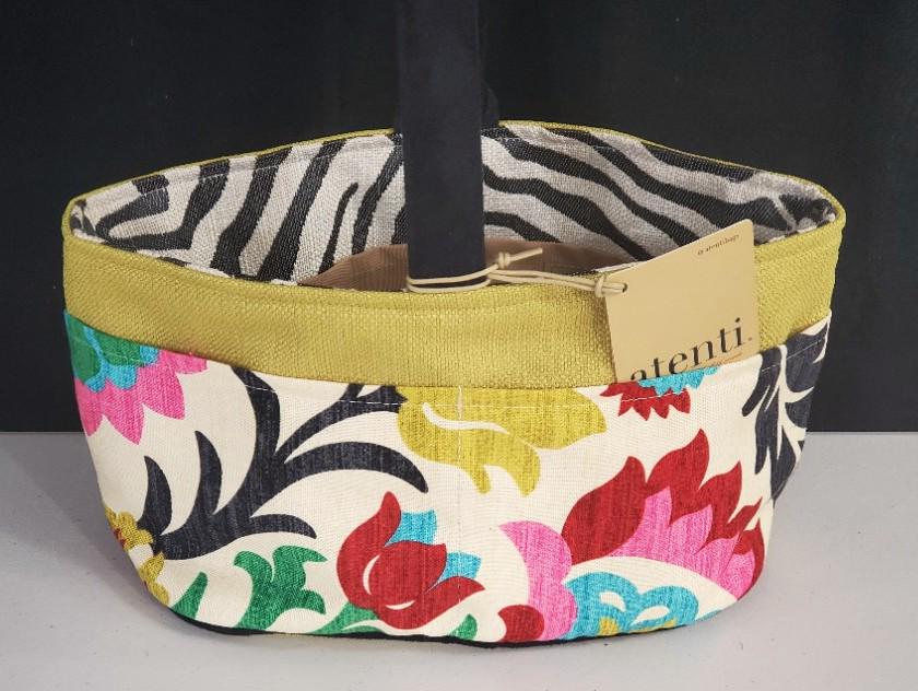 "SANTA MARIA" pattern - a multi-colored bright, bold floral with an avocado lining. Coordinating fabrics in gray/cream Cheetah, avocado linen and black ultra suede straps.