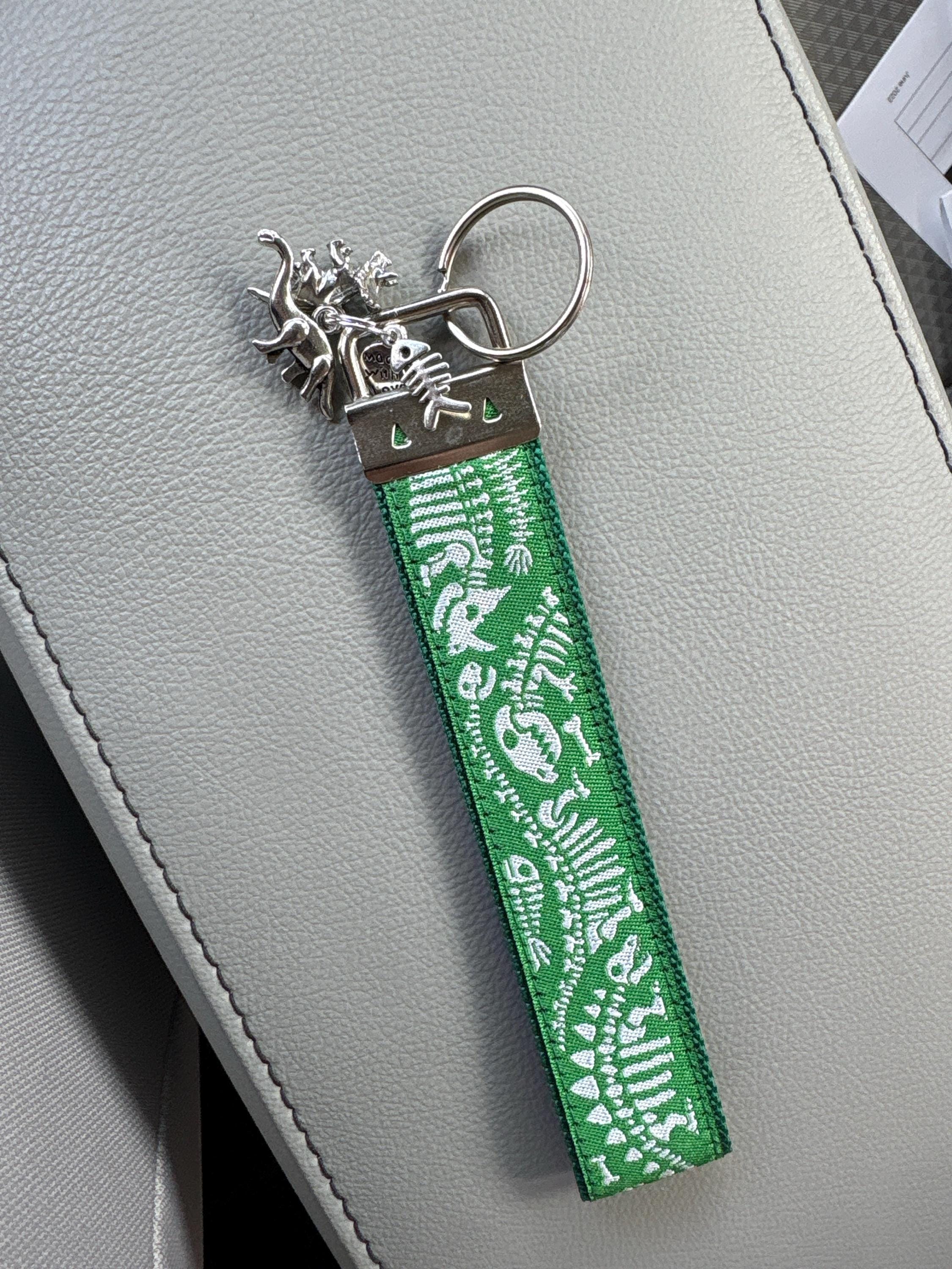 Green background with light gray skeleton dinosaur bones - charms include a dinosaur, a fish skeleton and "Made with Love" heart.