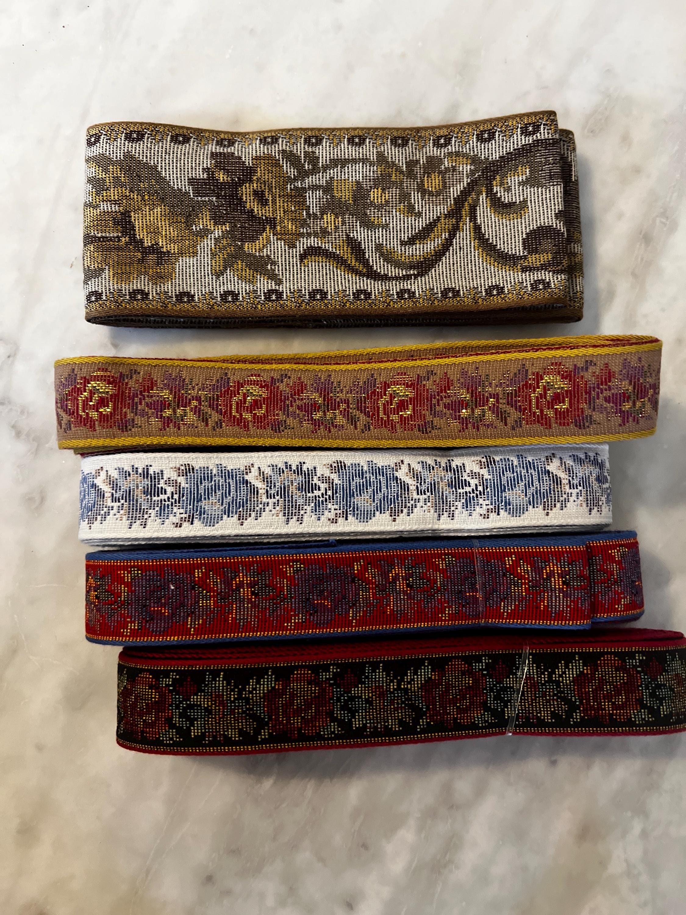 Jacquard Ribbon Trim - named for the man who invented the loom on which this trim is made - Joseph Marie Jacquard (France 1732-1854). Jacquard trims nowadays are woven using many different materials including rayon, polyester, metallic, cotton, blends and on rare occasion silk. Unless otherwise noted these trims are all cold water machine wash/dry and are colorfast. Please use your own judgment.