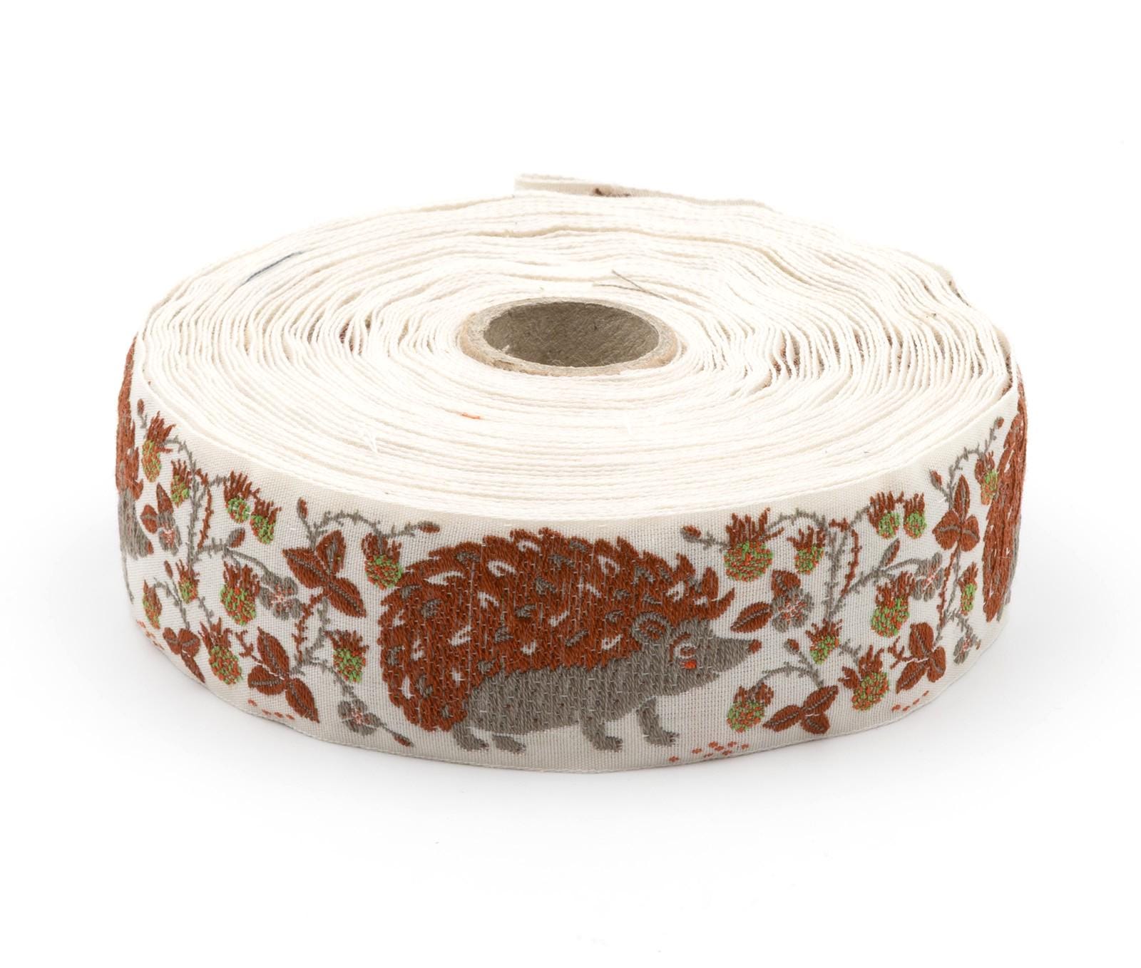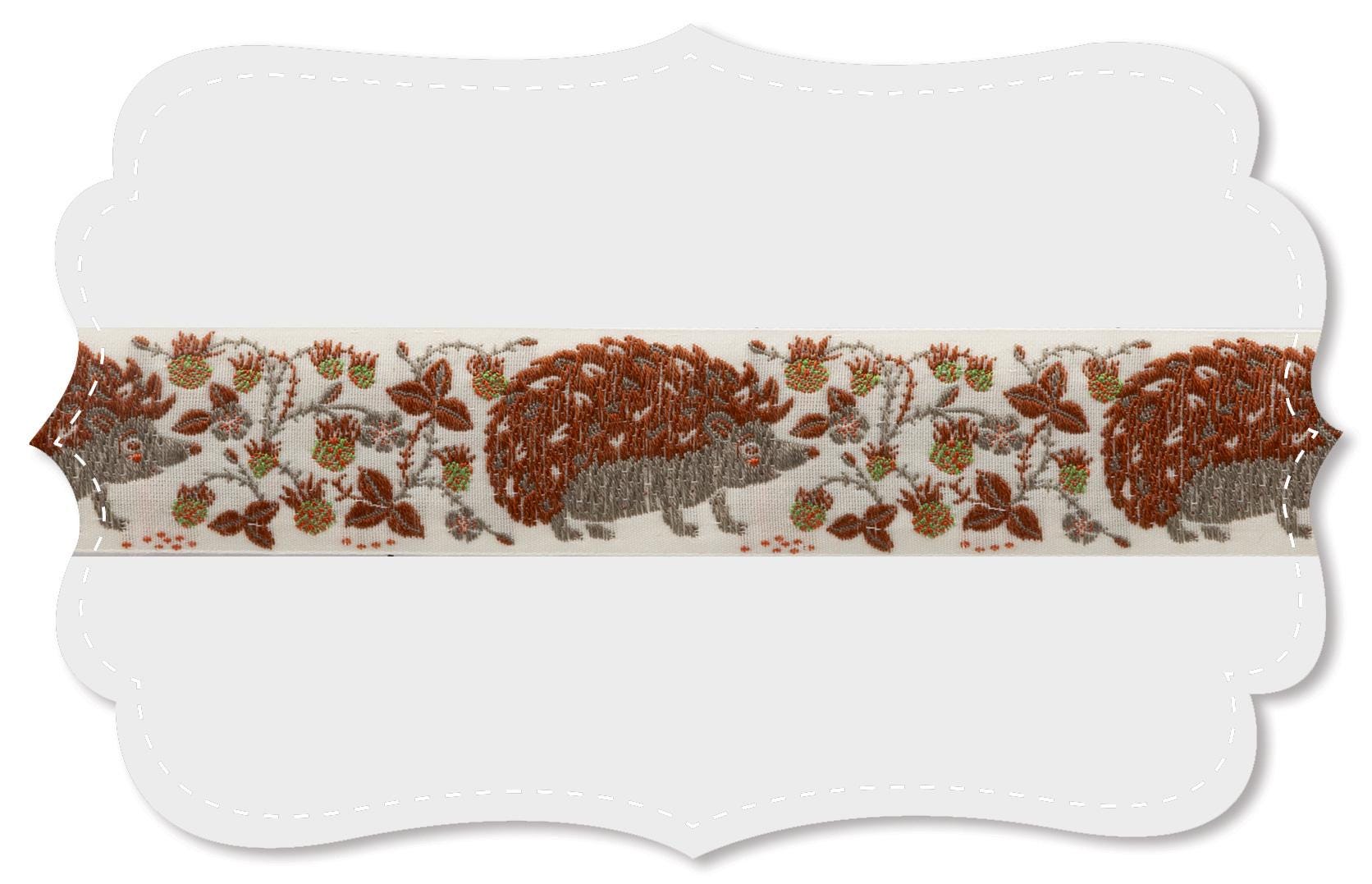 KAFKA G-33/03 Jacquard Ribbon Woven Organic Cotton Trim 1-1/4" wide (32mm) Ivory Background w/Gray & Rust Hedgehogs