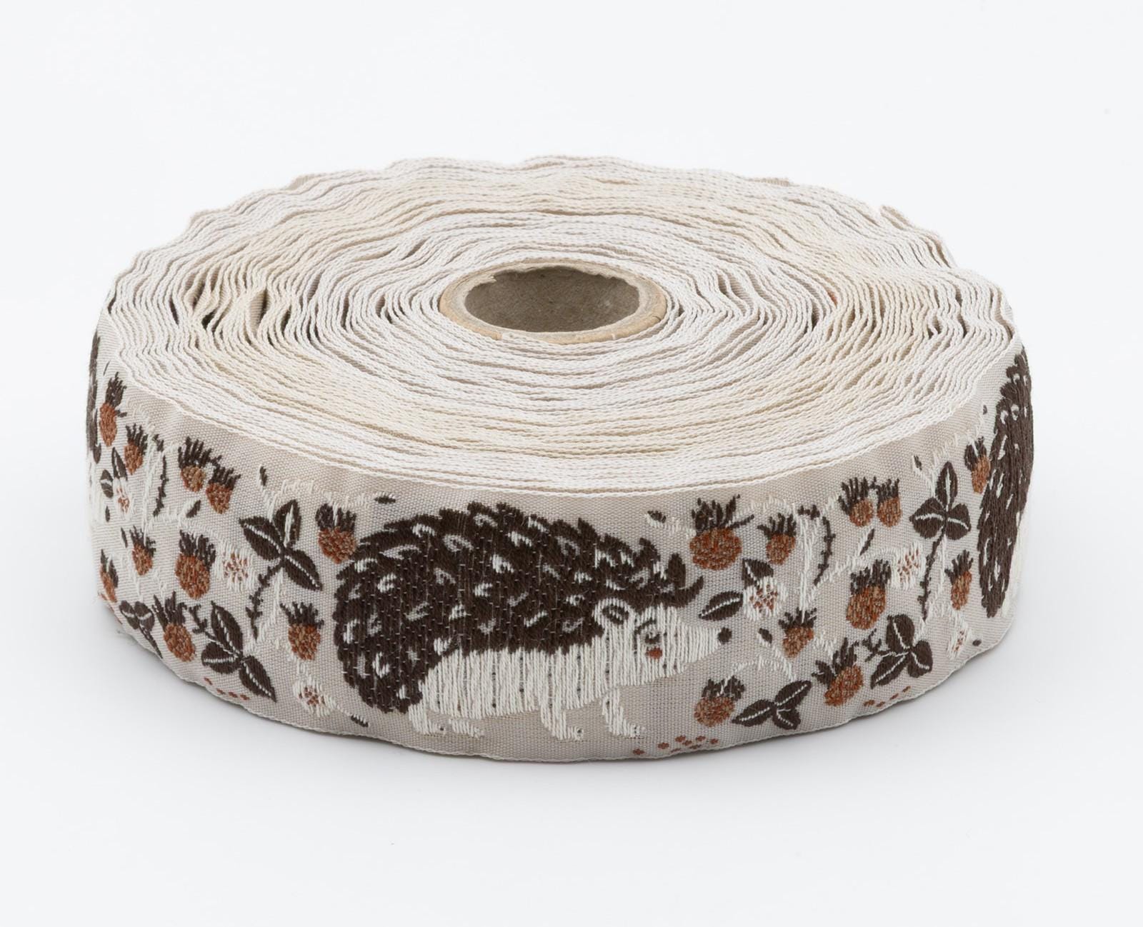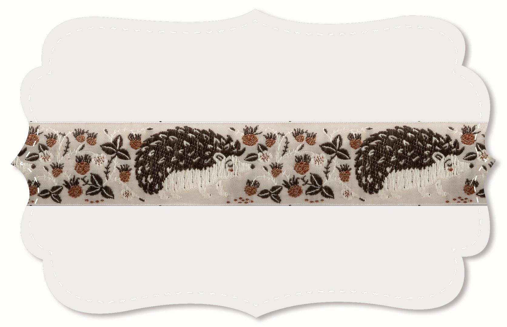 KAFKA G-33/05 Jacquard Ribbon Woven Organic Cotton Trim 1-1/4" wide (32mm) Beige Background w/Brown & Ivory Hedgehogs
