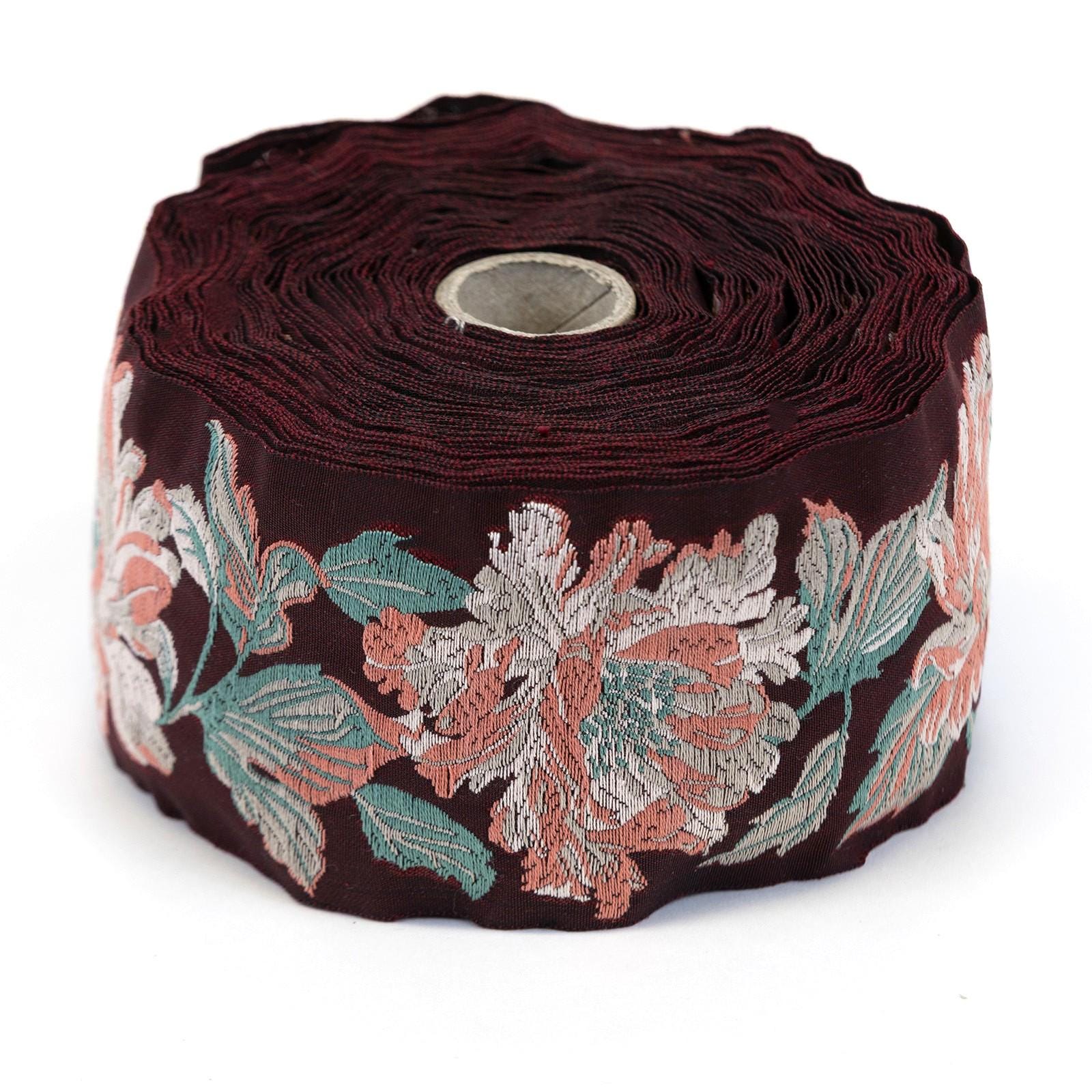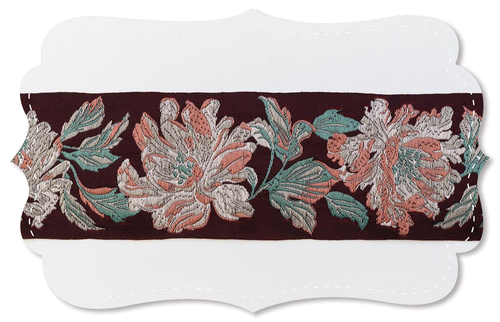 KAFKA L-08/01 Jacquard Ribbon Woven Organic Cotton Trim 2-3/8" wide (60mm) NEW! Brown w/Large Peonies in Apricot, Tan & Lt Pink