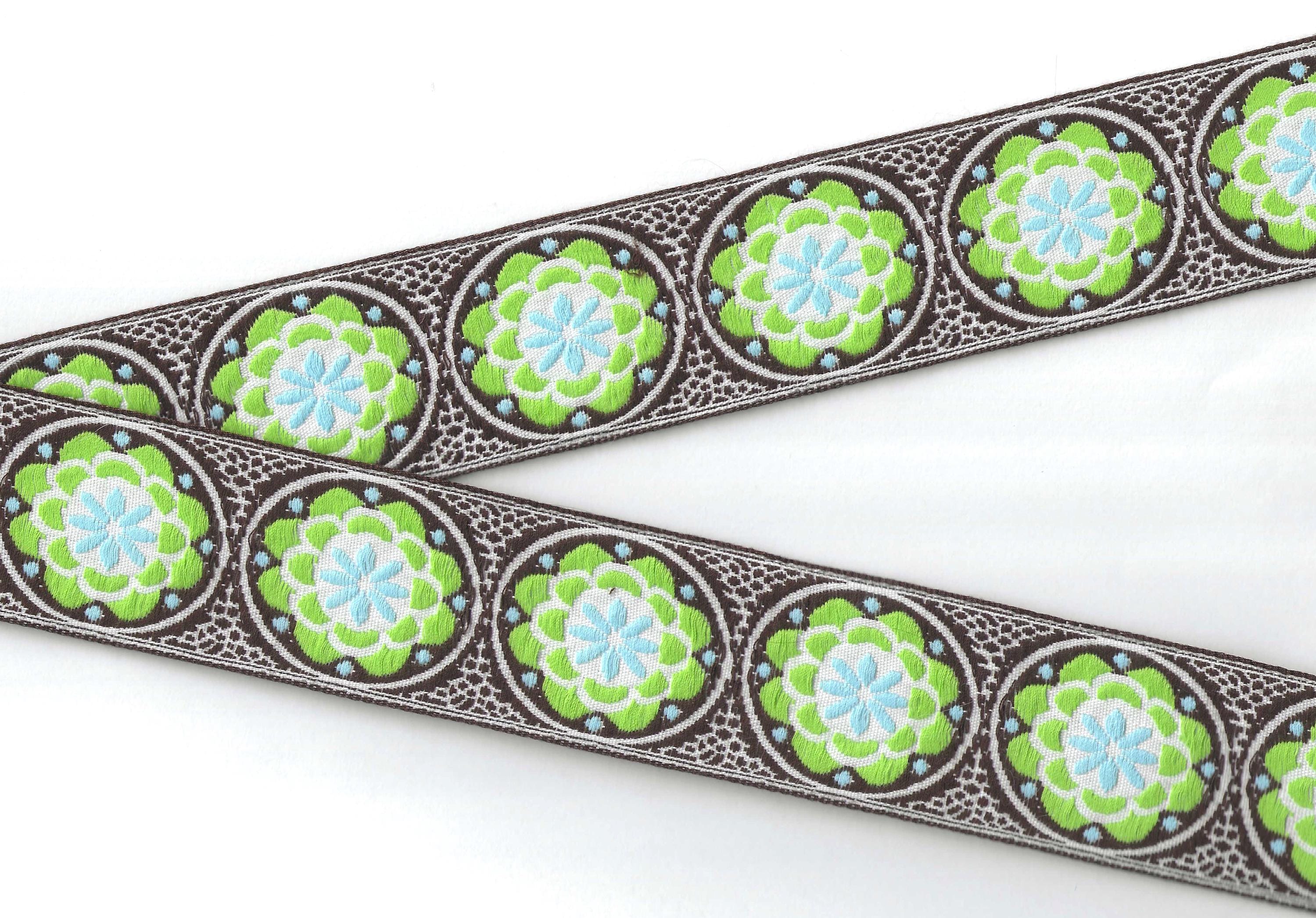 FLORAL K-11-B Jacquard Ribbon Cotton/Poly Trim 1-7/8" wide (48mm) VINTAGE Brown/White Background w/Lime, Blue & White Accents