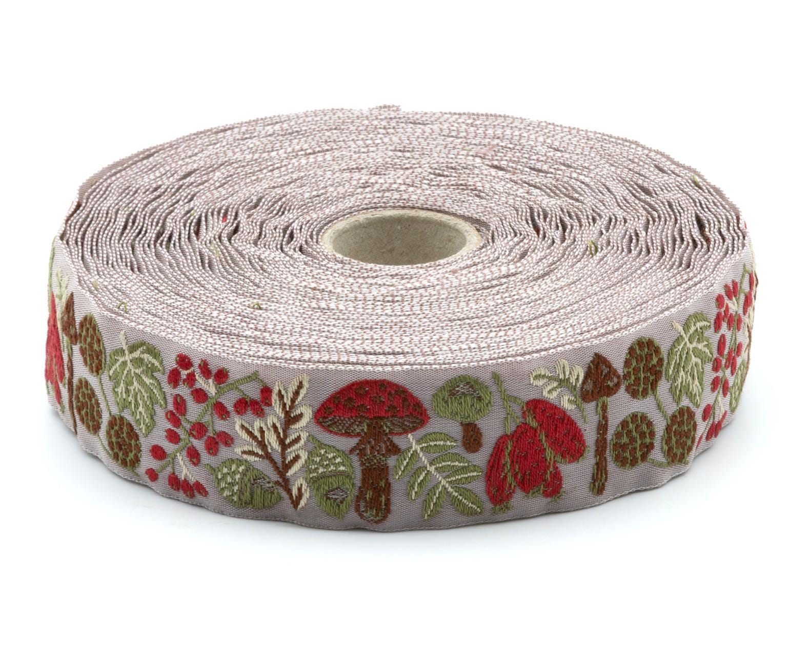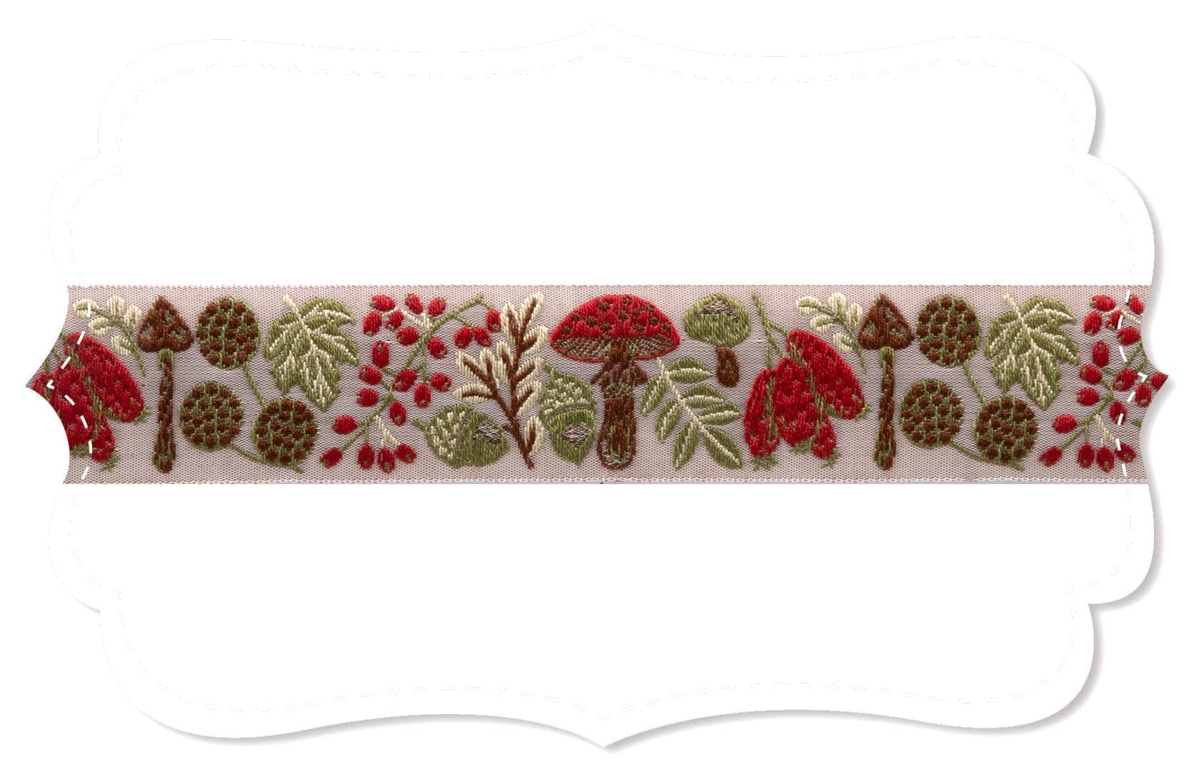 KAFKA F-19/05 Jacquard Ribbon Woven Organic Cotton Trim 1" wide (25mm) NEW! Rose-Beige Background w/Toadstools, Leaves & Autumn Fruits