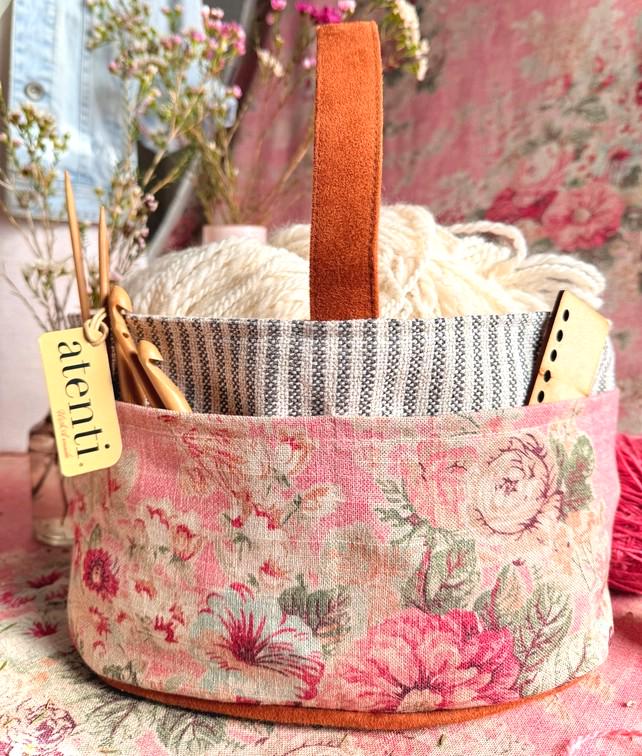 The small bucket organizer is great to store and keep handy all your tools and notions. This bag handles smaller projects like hats, socks, scarves or baby/children's clothing. Fully lined in a water resistant taffeta and has an ample center section. Four outside/four inside pockets keep smaller items separate. An ultra suede handle with a secure loop (for closing).