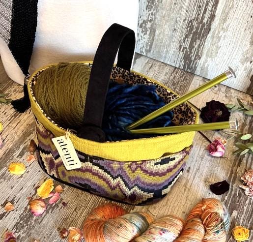 The small bucket organizer is great to store and keep handy all your tools and notions. This bag handles smaller projects like hats, socks, scarves or baby/children's clothing. Fully lined in a water resistant taffeta and has an ample center section. Four outside/four inside pockets keep smaller items separate. An ultra suede handle with a secure loop (for closing).