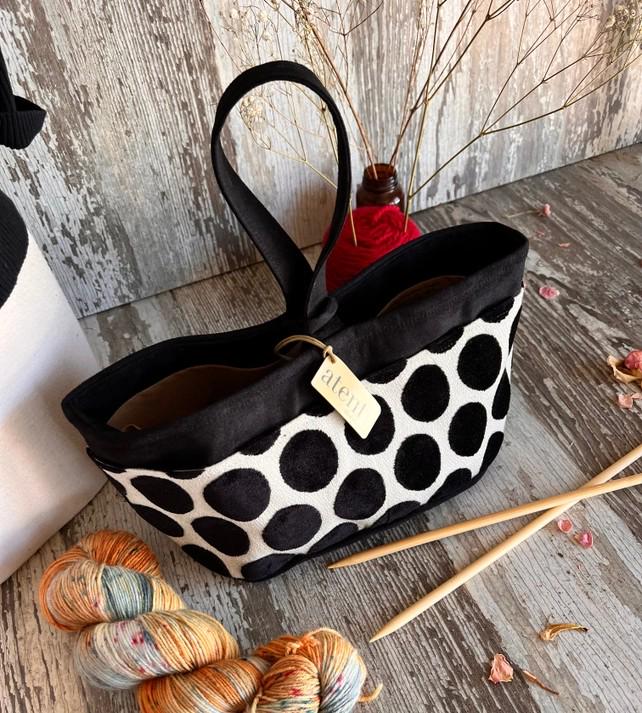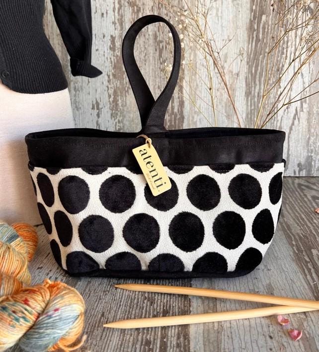 The small bucket organizer is great to store and keep handy all your tools and notions. This bag handles smaller projects like hats, socks, scarves or baby/children's clothing. Fully lined in a water resistant taffeta and has an ample center section. Four outside/four inside pockets keep smaller items separate. An ultra suede handle with a secure loop (for closing).