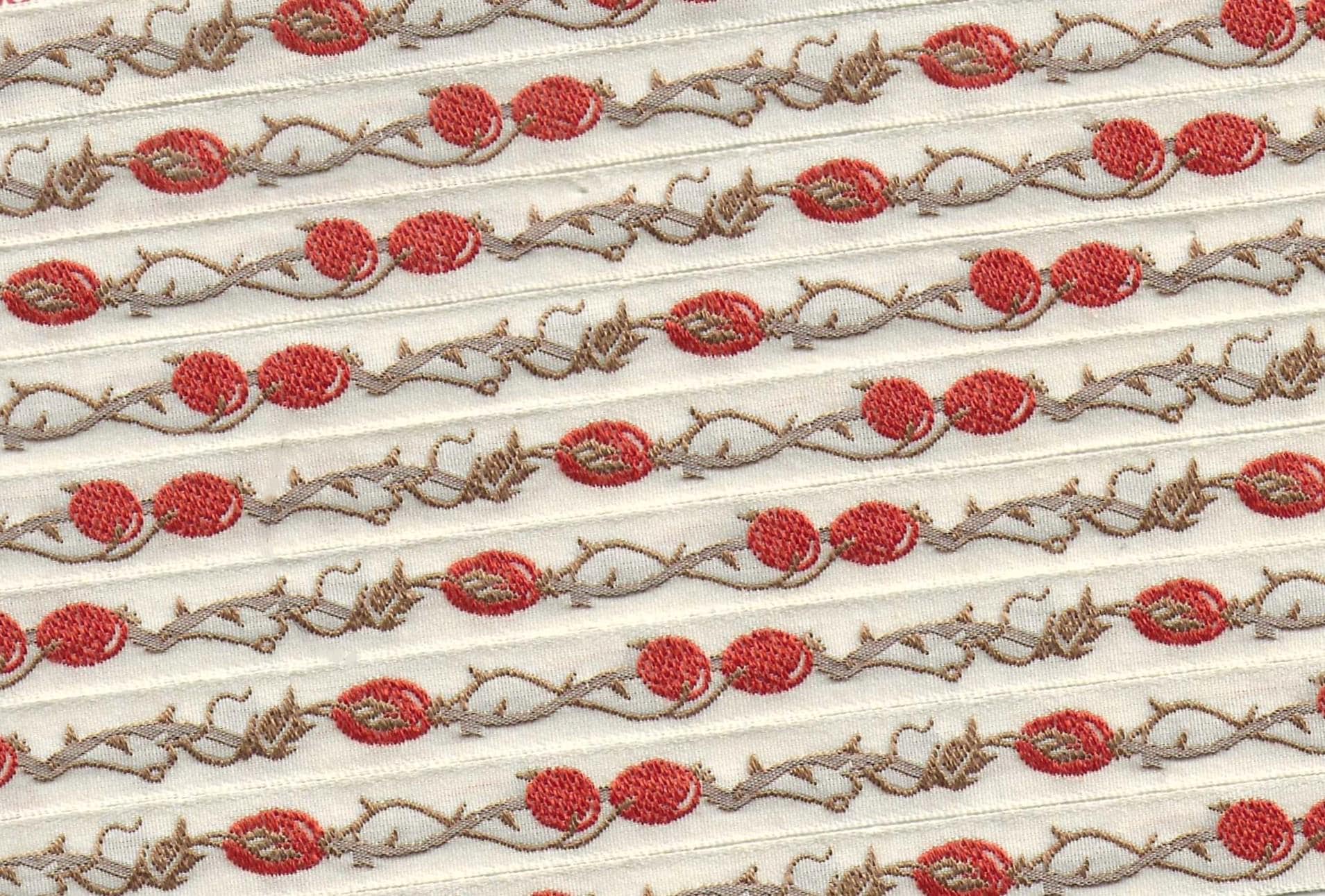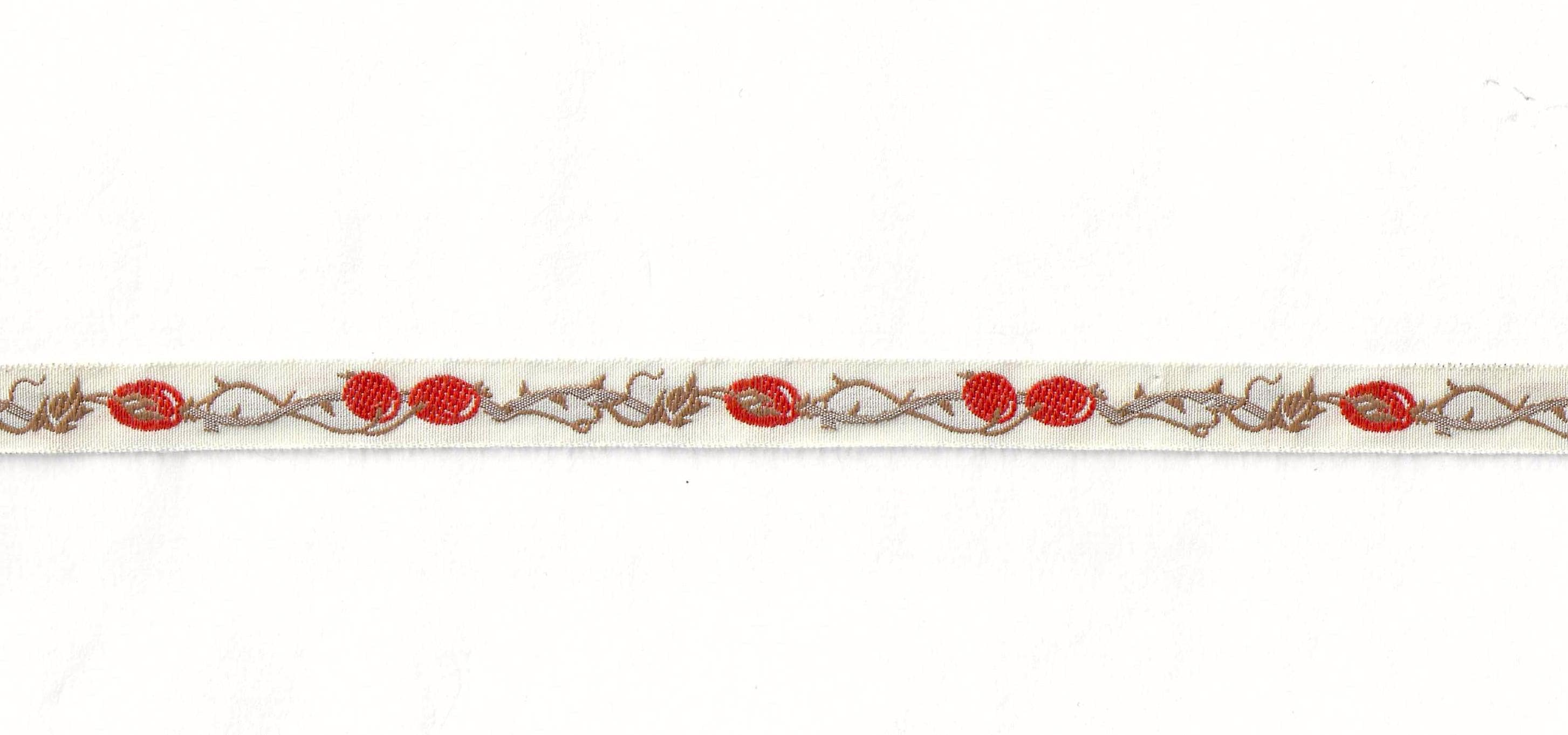 KAFKA A-10/01 Jacquard Ribbon Organic Cotton Woven Trim 3/8" wide (10mm) Ivory Background, Small Orange Rose Hip Berries, Lt Brown Vines
