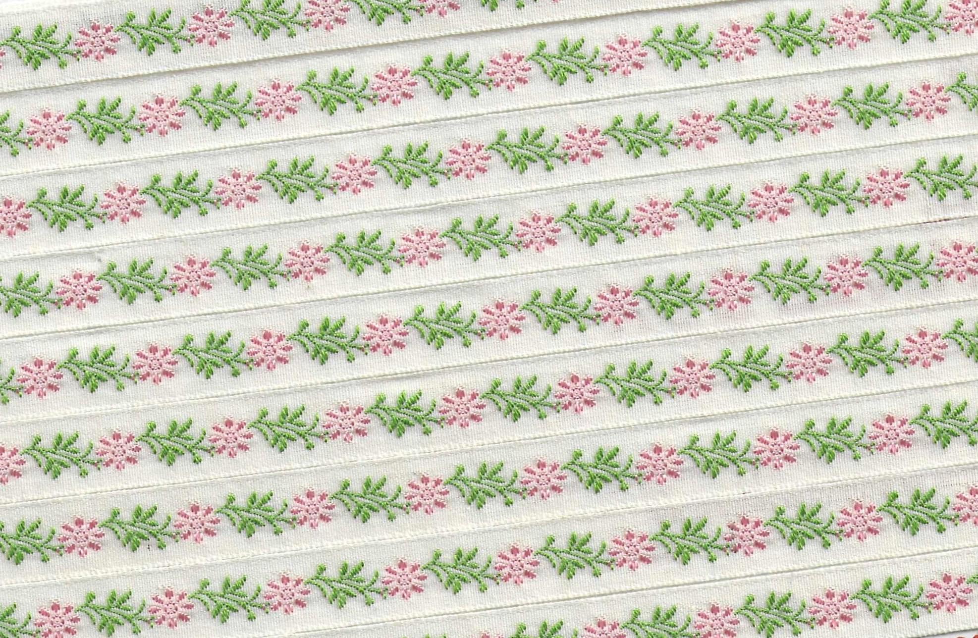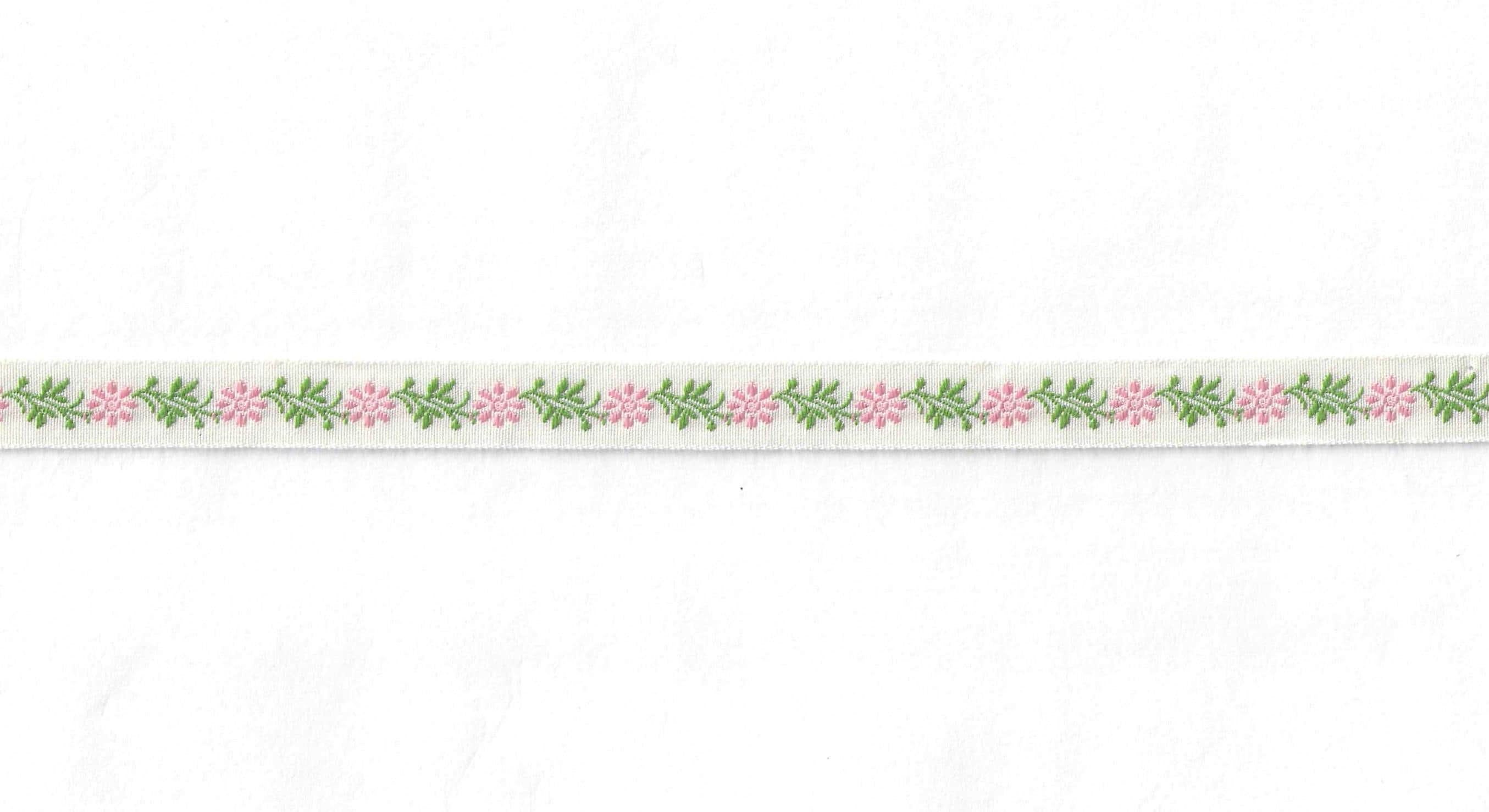 KAFKA A-02/102 Jacquard Ribbon Woven Organic Cotton Trim 7/16" wide (10mm) Ivory w/Pink Flowers, Green Leaves
