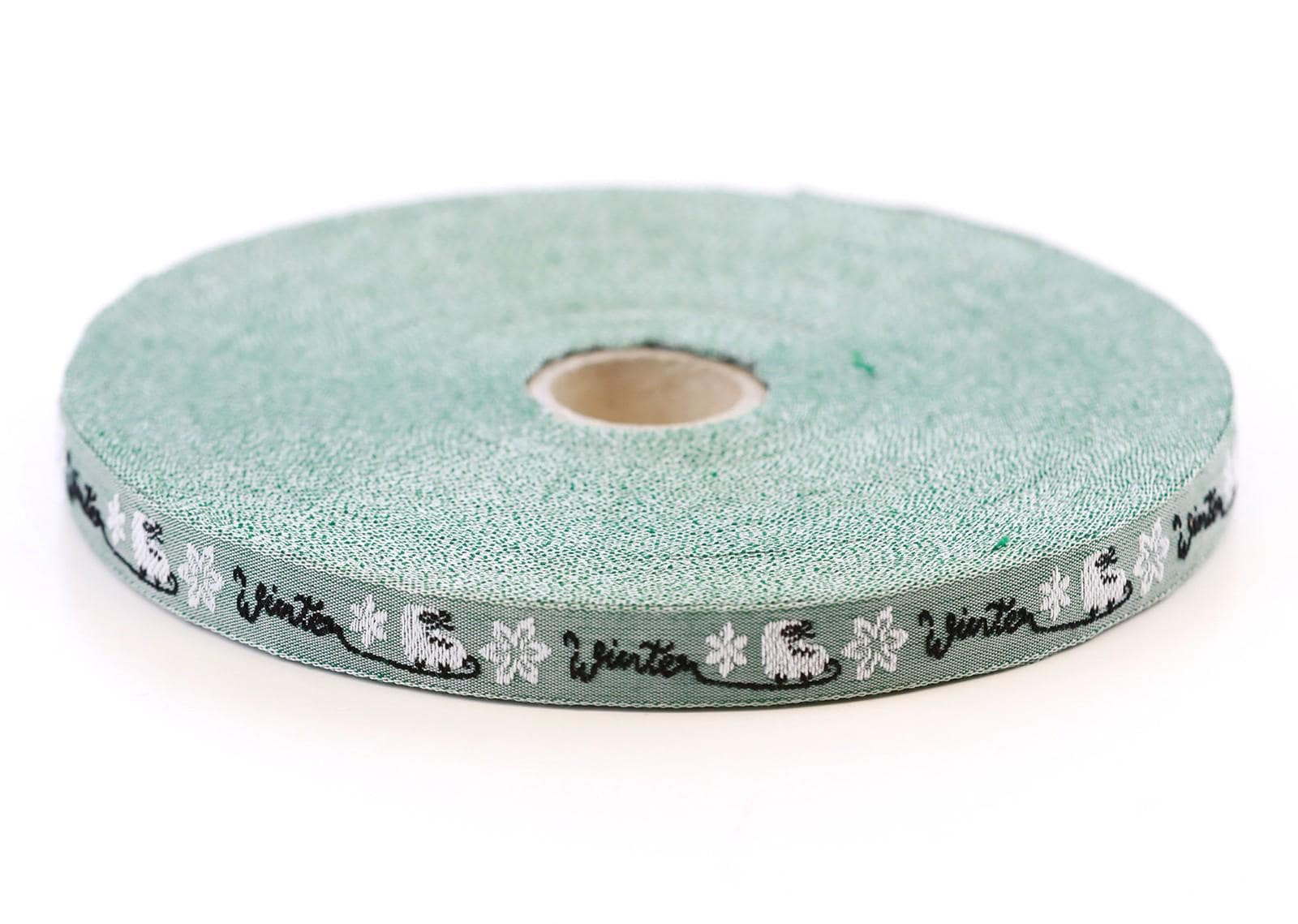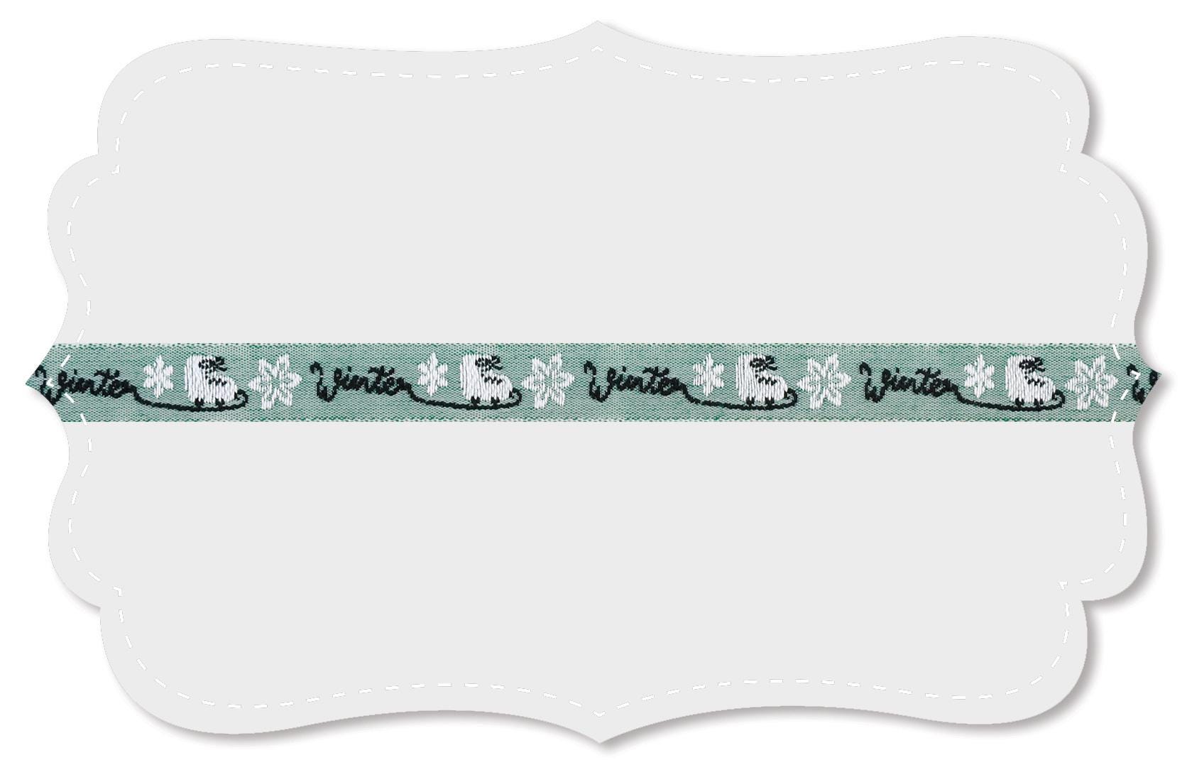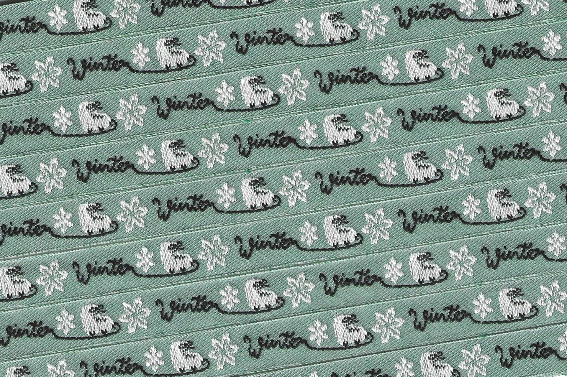 KAFKA A-18/02 Jacquard Ribbon Woven Organic Cotton Trim 7/16" wide (10mm) Sage Green Background w/White Ice Skates and Black "WINTER" Words