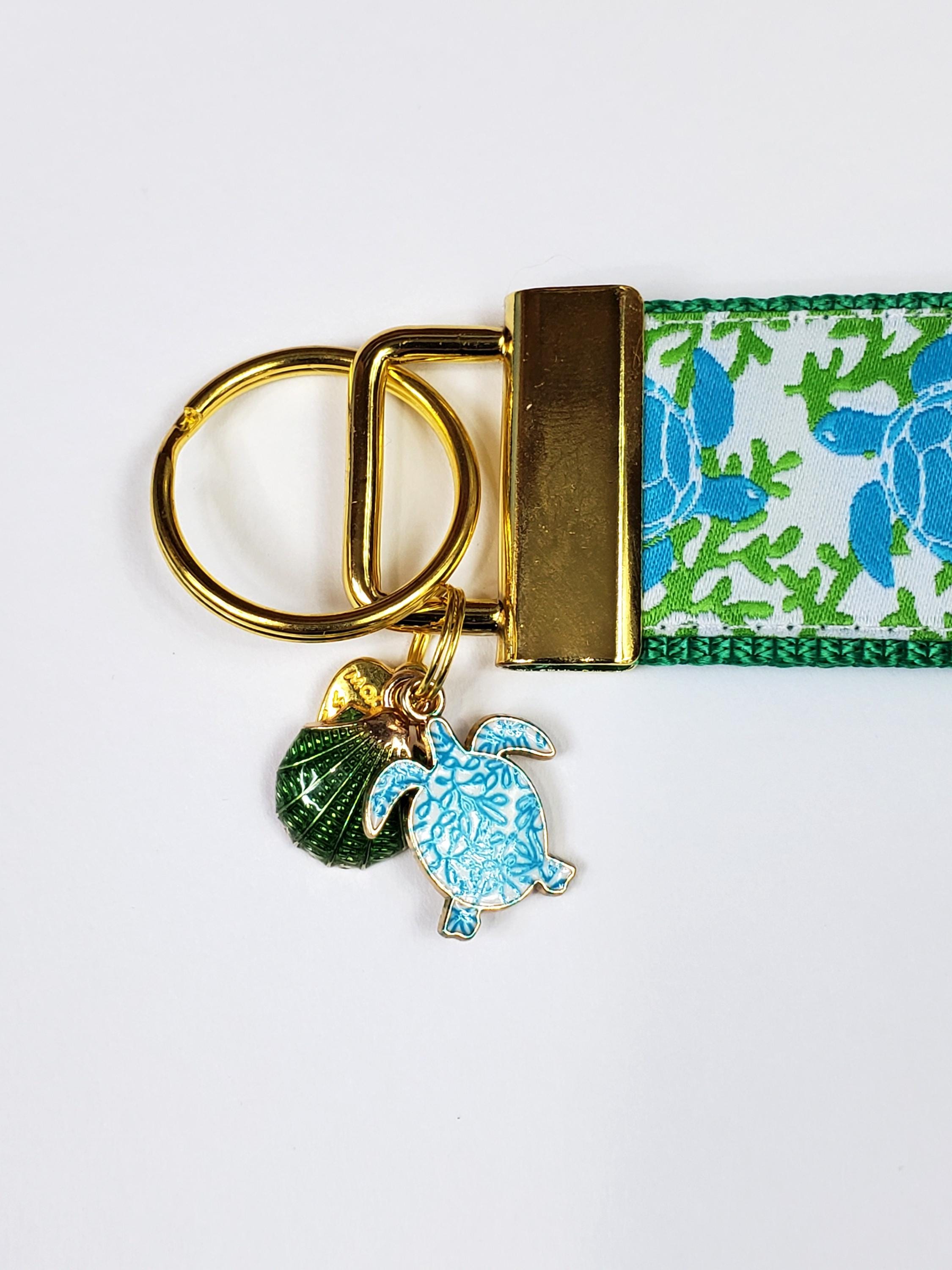Turtles & Coral Reef on green web - charms include turtle, a seashell and a "Made with Love" heart.