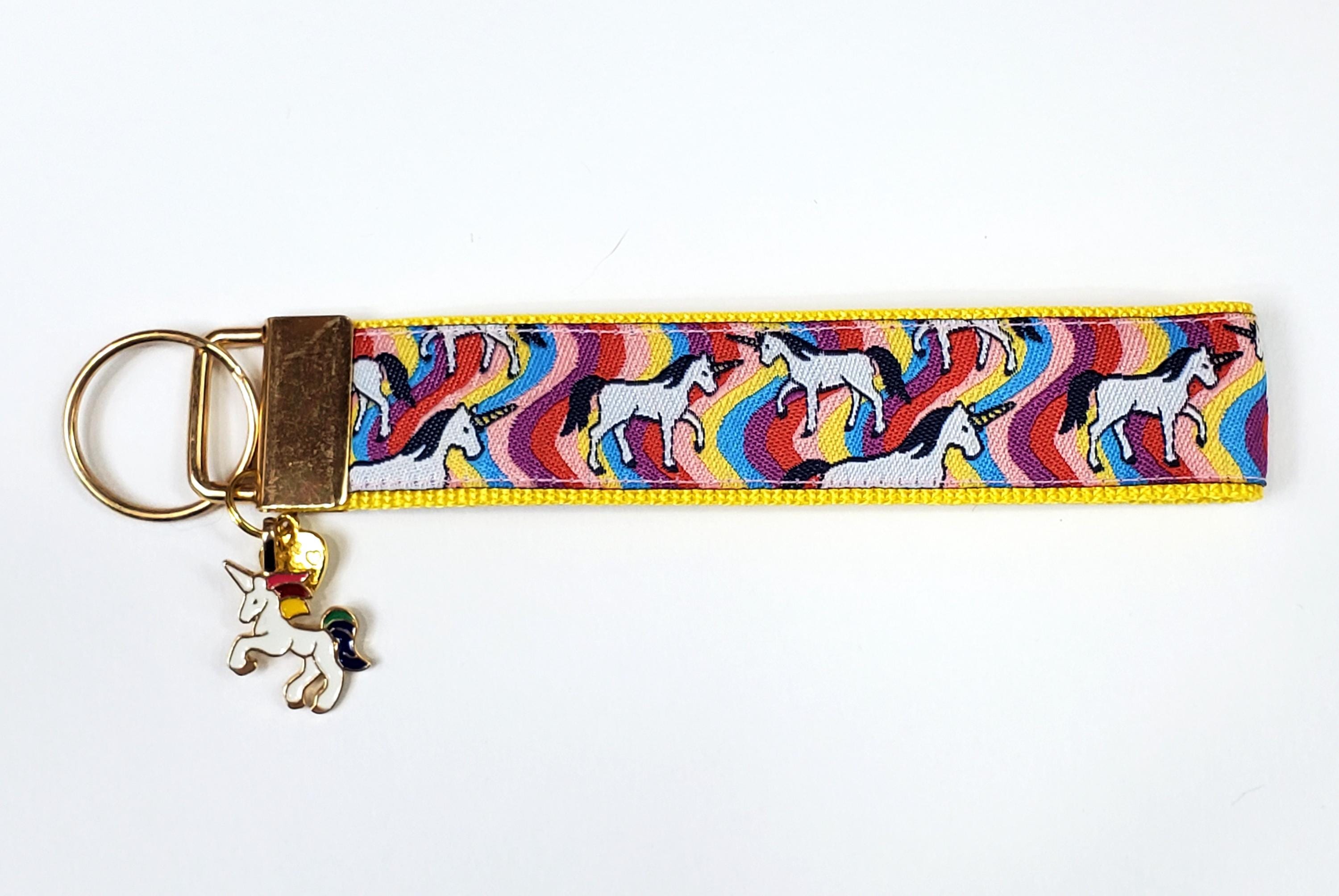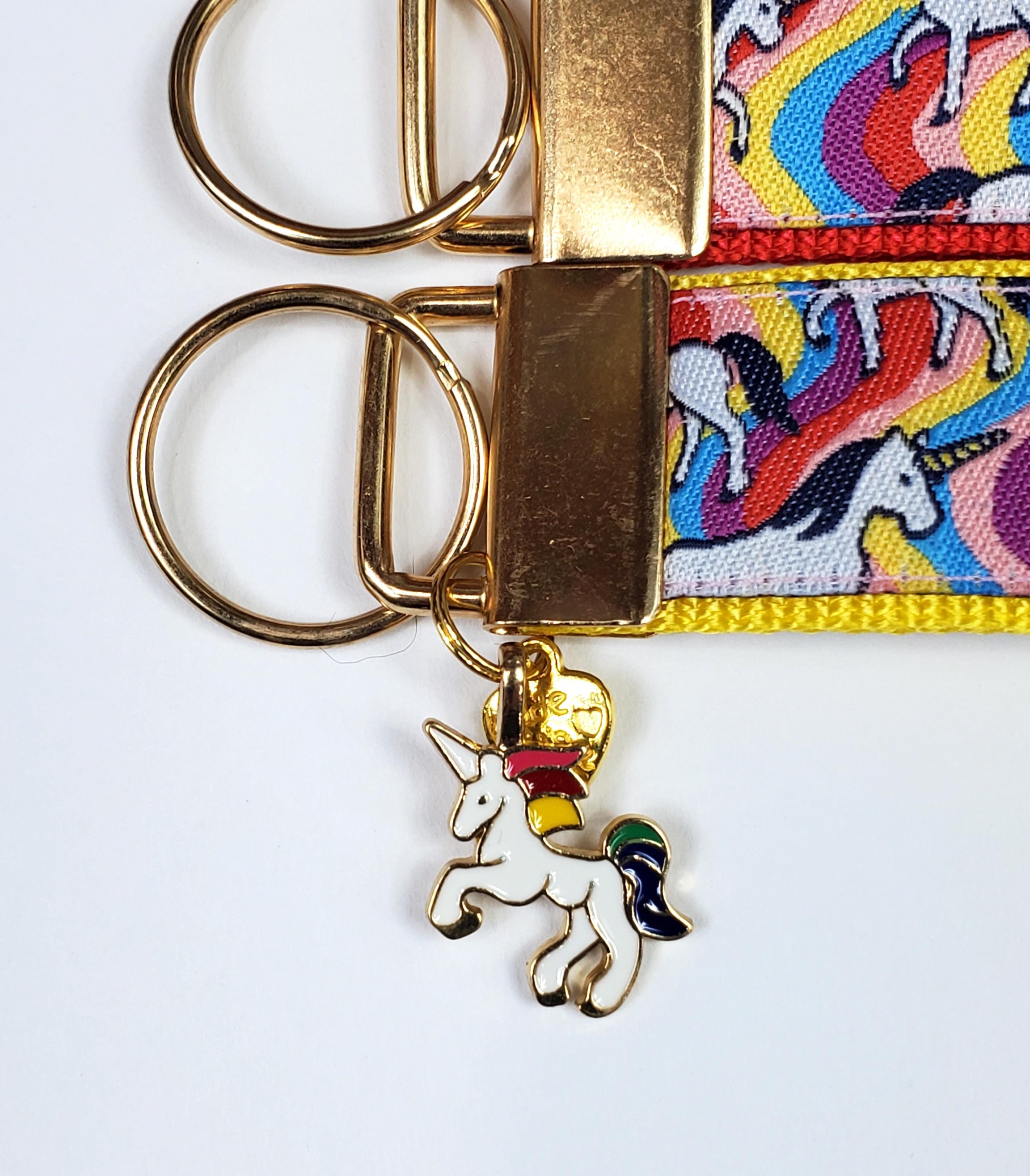 Unicorns on a Rainbow Background - charms include a unicorn and a "Made with Love" heart.