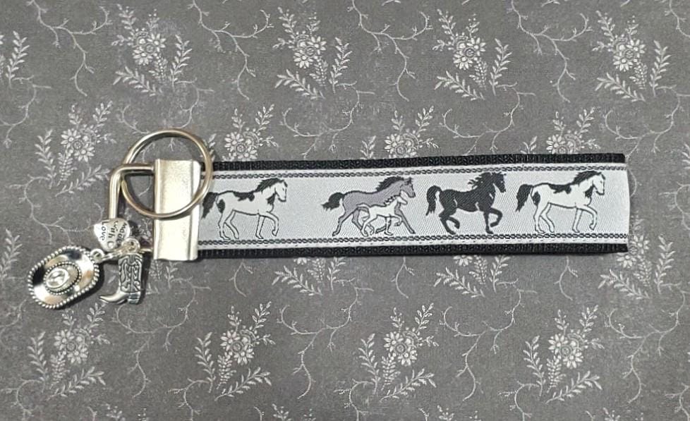 Gray background on black web with a Trio of Horses - charms include a Cowboy Hat, a Cowboy Boot and a "Made with Love" heart.