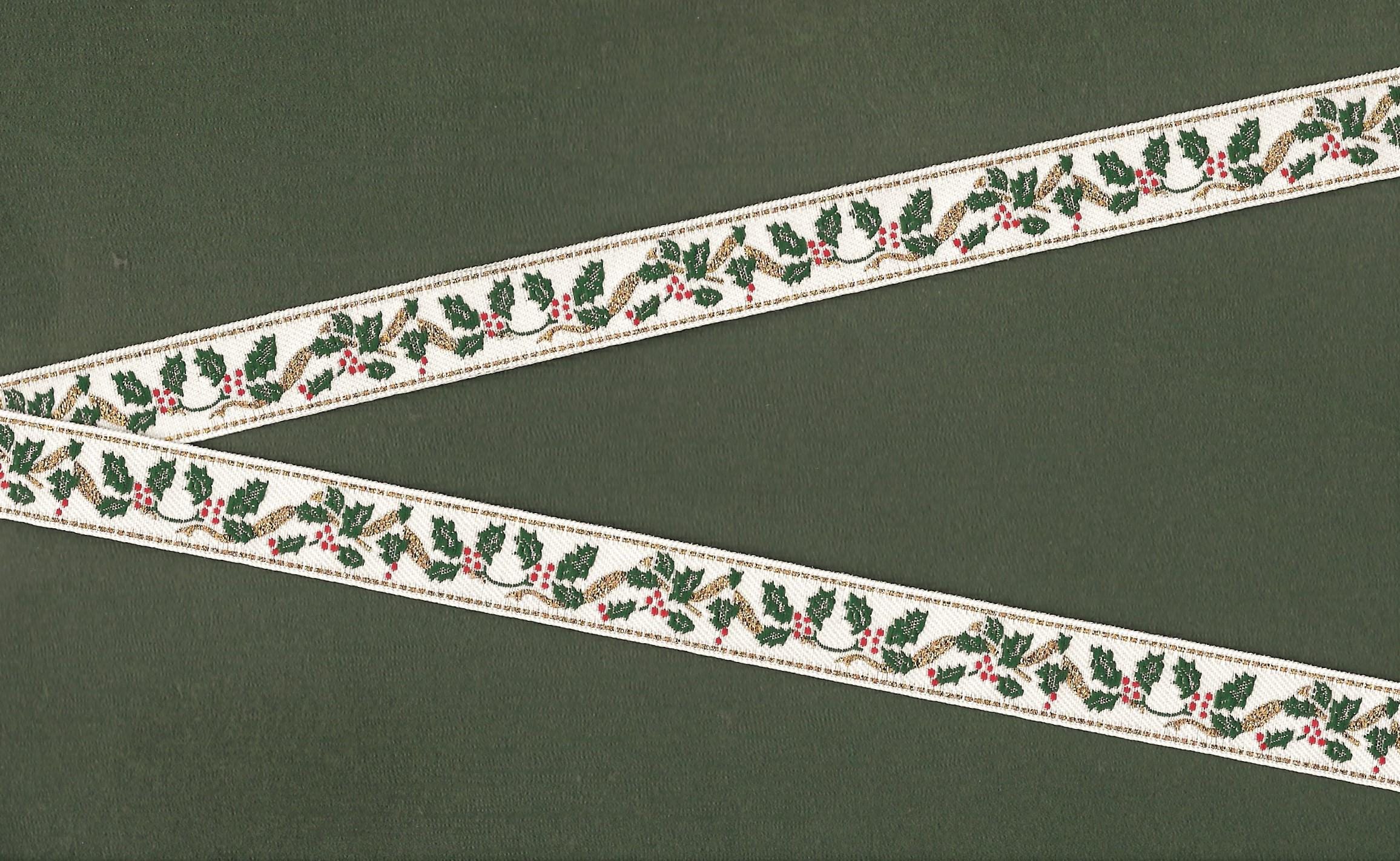 5/8" wide (16mm) White w/Holly Leaves & Berries, Metallic Gold Accents