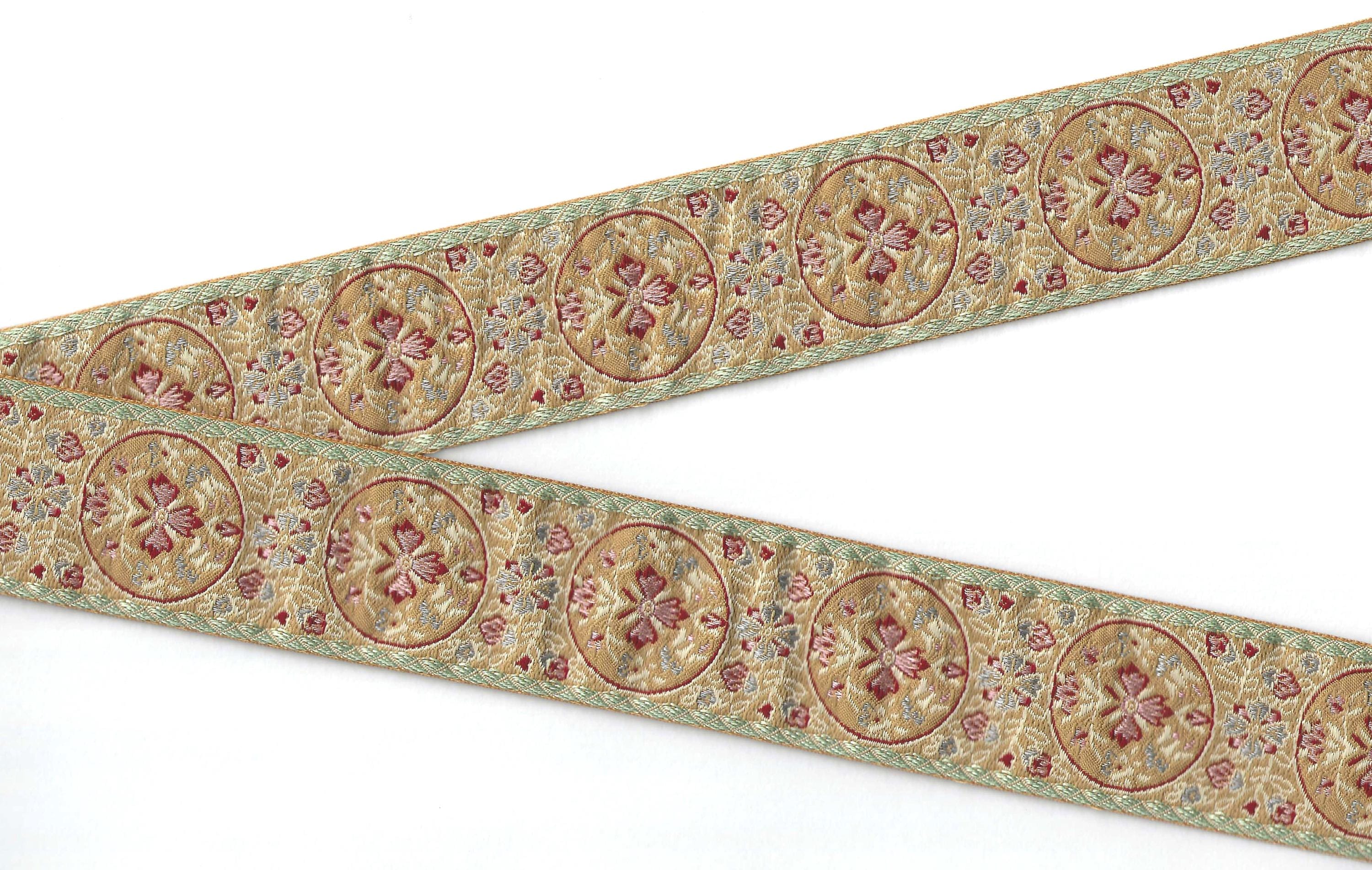 This is a popular ribbon for Renaissance/Medieval costumes - it's medallion design is pretty accurate for the period. Medium weight, nice tight weave.