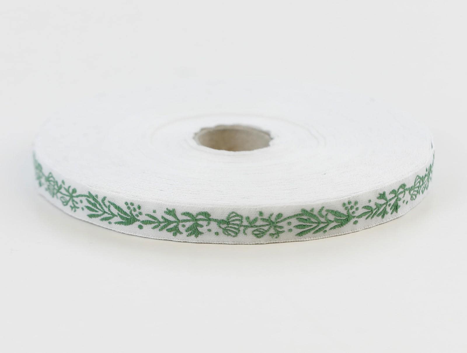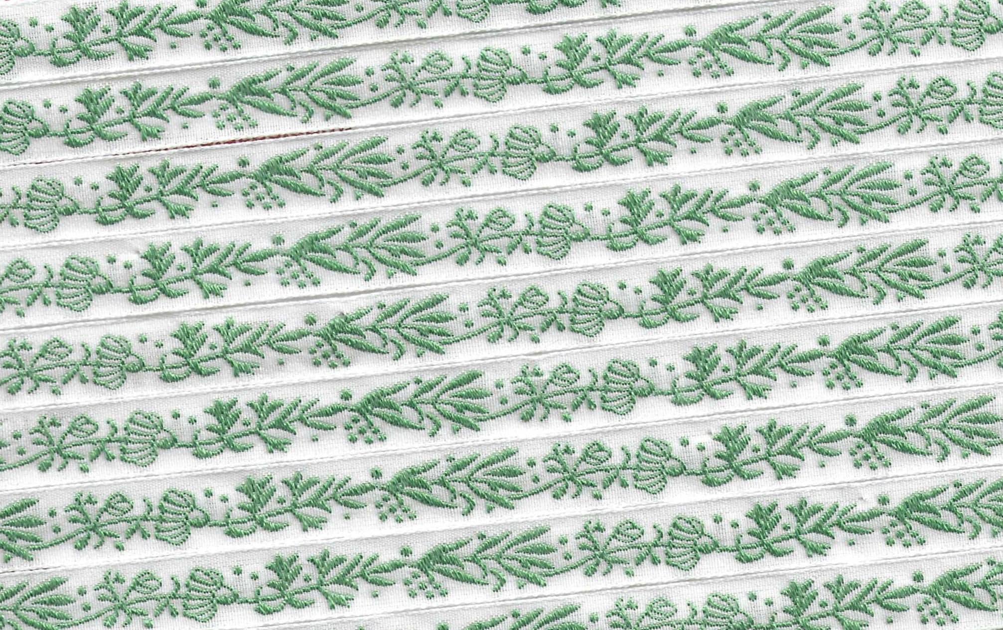 From Germany, Kafka Band Weaving Mills have made jacquard ribbons for antique wood looms for over 100 years. Only several meters are made per hour with this process.