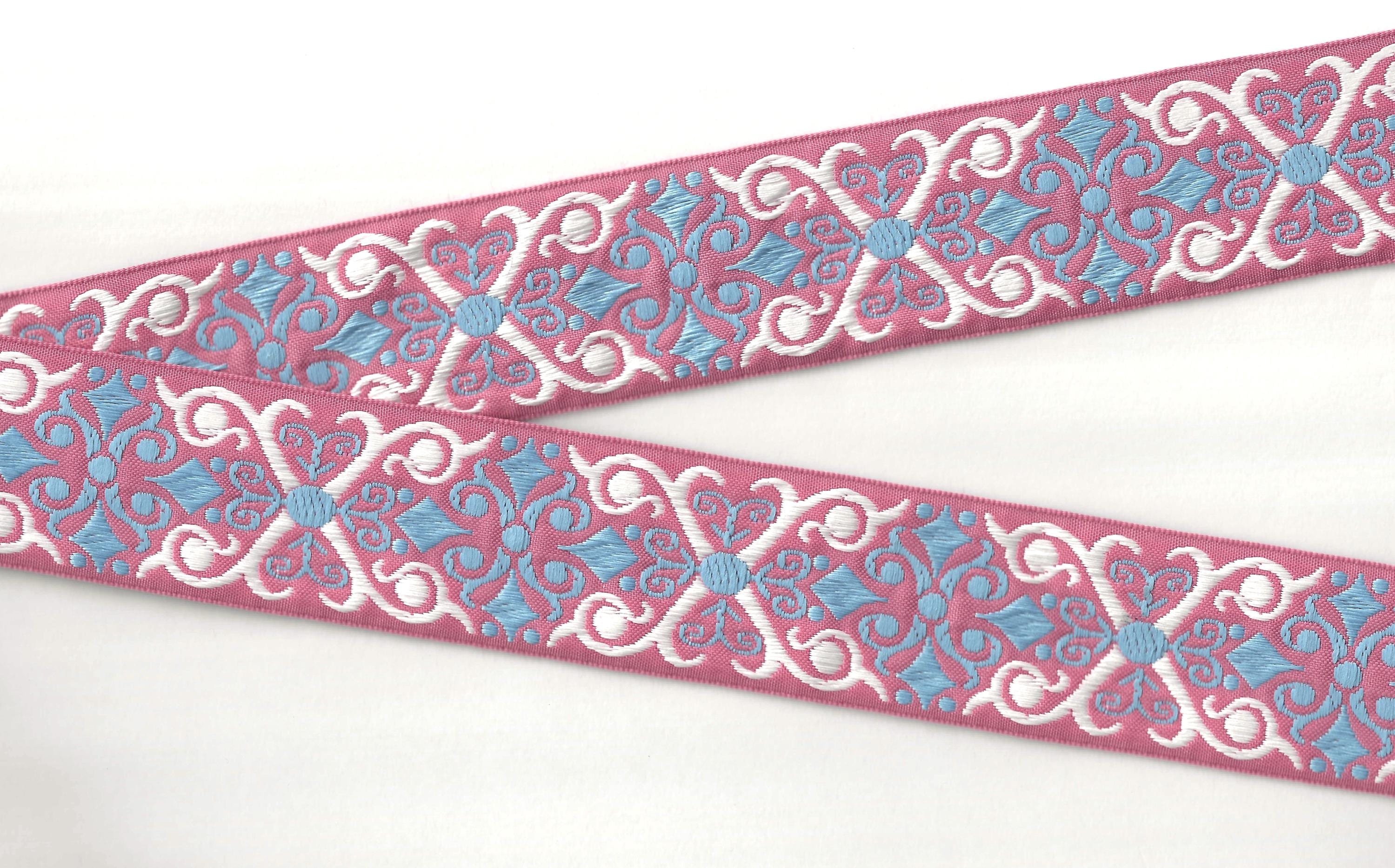 Jacquard Ribbon Trim - named for the man who invented the loom on which this trim is made - Joseph Marie Jacquard (France 1732-1854). Jacquard trims nowadays are woven using many different materials including rayon, polyester, metallic, cotton, blends and on rare occasion silk. Unless otherwise noted these trims are all cold water machine wash/dry and are colorfast. Please use your own judgment.