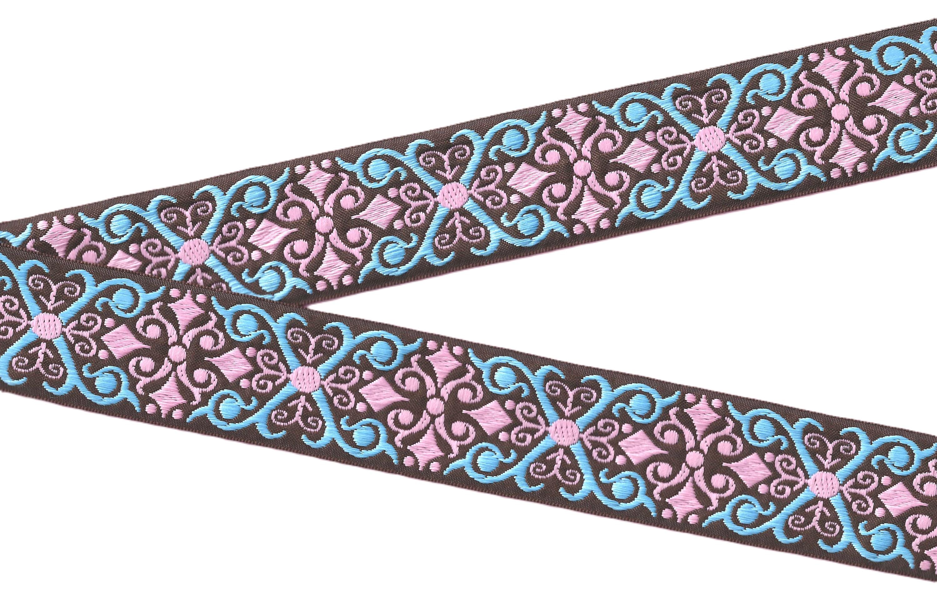 GEOMETRIC H-09-N Jacquard Ribbon Poly Trim 1-1/2" wide (38mm) Brown w/Turquoise & Pink