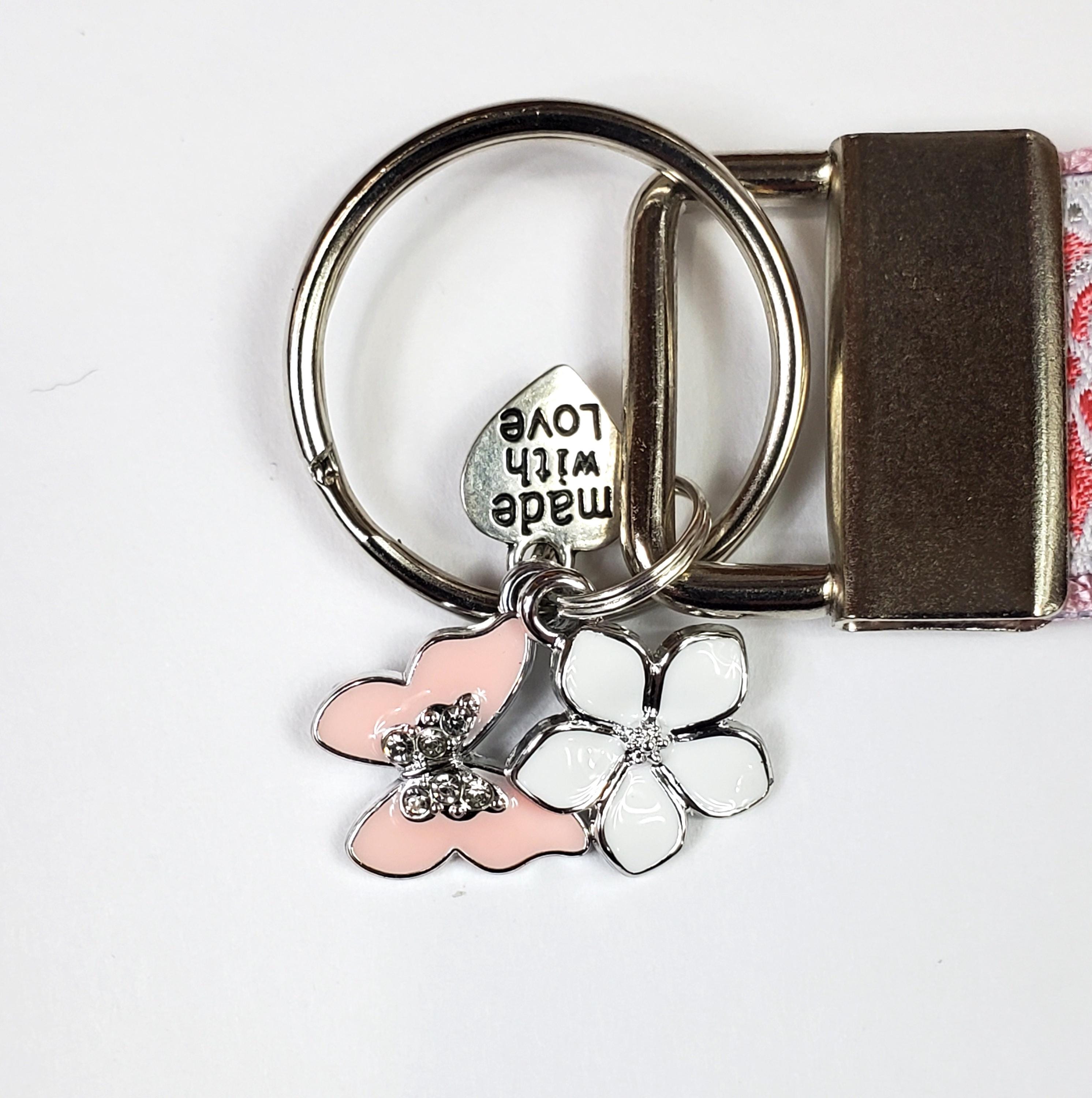 Pink Web with Coral pink, Gray & Silver metallic accents - charms include a daisy, pink rhinestone butterfly and a "Made with Love" heart.