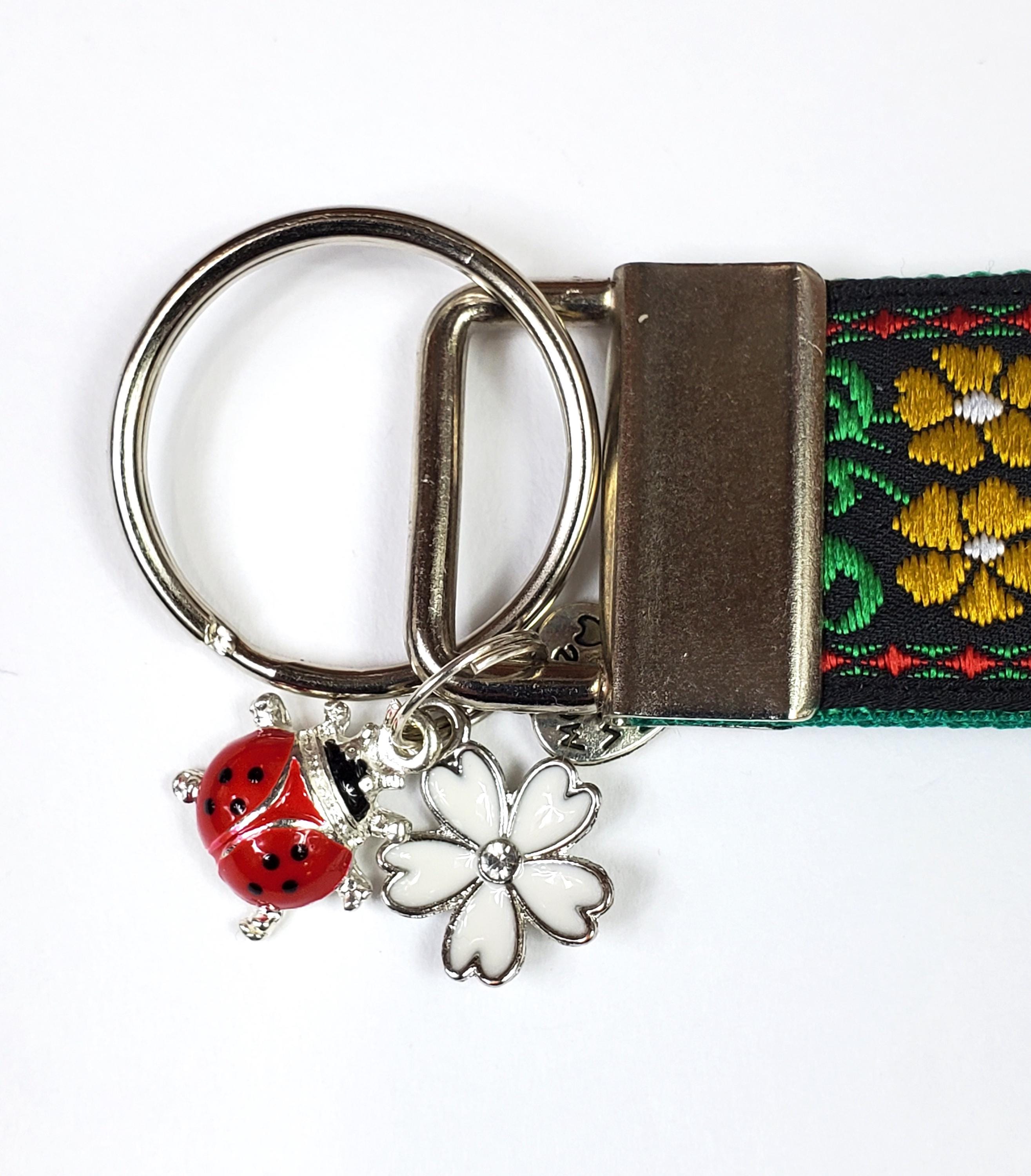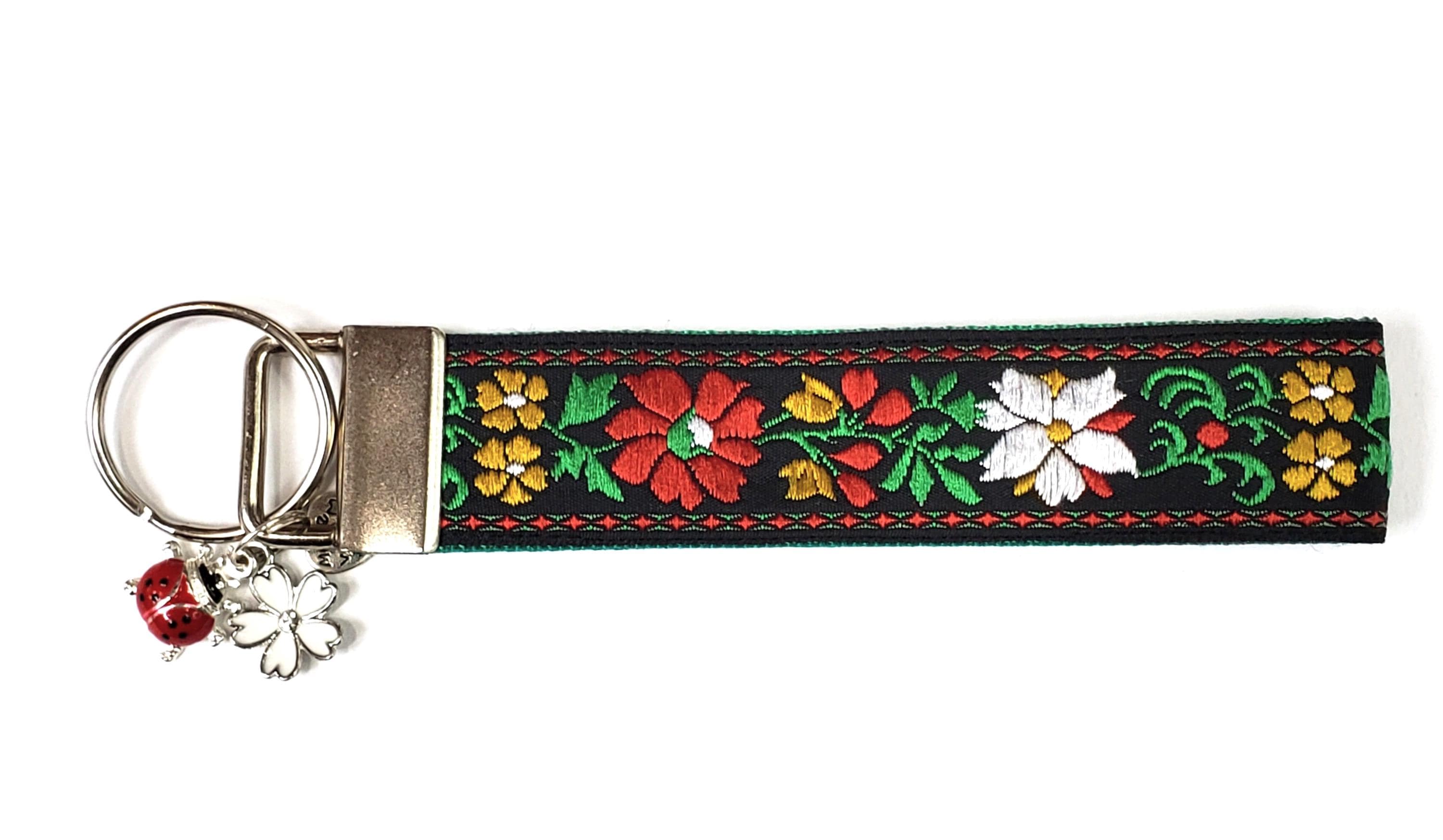 Handmade key fob with charms - my key fobs are made using jacquard woven ribbons and nylon web.