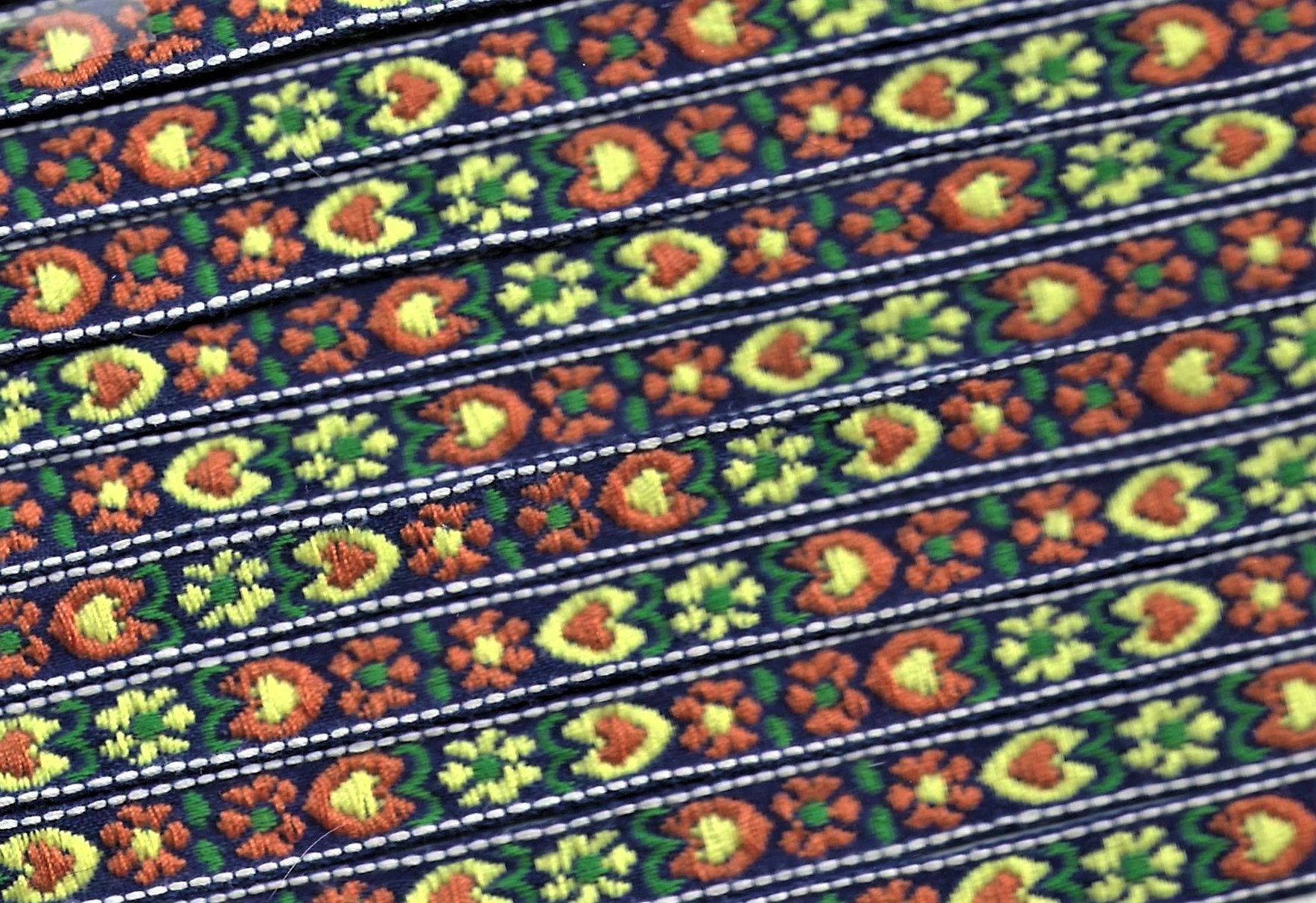 Jacquard Ribbon Trim - named for the man who invented the loom on which this trim is made - Joseph Marie Jacquard (France 1732-1854). Jacquard trims nowadays are woven using many different materials including rayon, polyester, metallic, cotton, blends and on rare occasion silk. Unless otherwise noted these trims are all cold water machine wash/dry and are colorfast. Please use your own judgment.