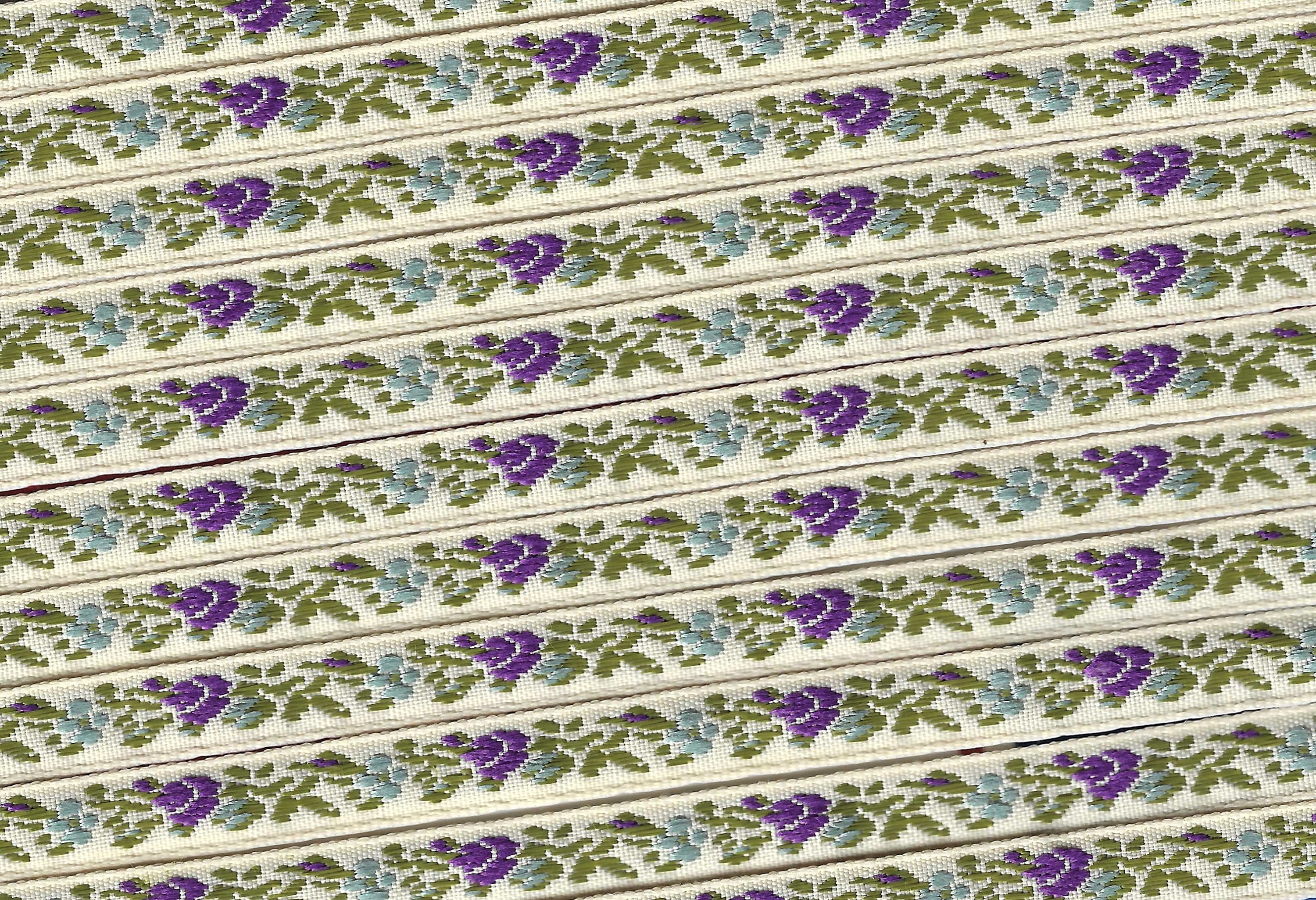 Jacquard Ribbon Trim - named for the man who invented the loom on which this trim is made - Joseph Marie Jacquard (France 1732-1854). Jacquard trims nowadays are woven using many different materials including rayon, polyester, metallic, cotton, blends and on rare occasion silk. Unless otherwise noted these trims are all cold water machine wash/dry and are colorfast. Please use your own judgment.