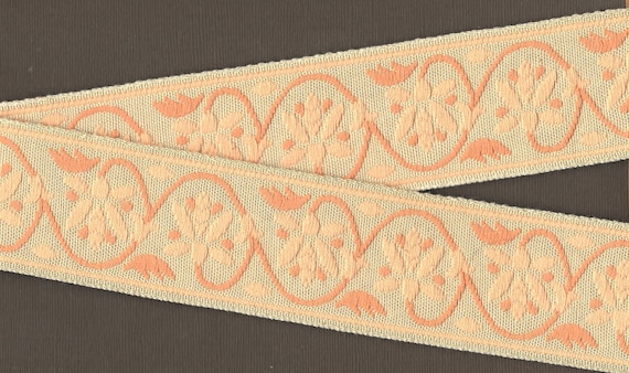 FLORAL G-119-A Jacquard Ribbon Poly Trim 1-1/8" wide (28mm) Douglas Paquette, Cream w/Peach & Teal in a Floral/Paisley Design, Per Yard