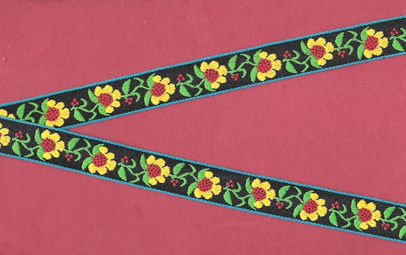 FLORAL B-20-C Jacquard Ribbon Woven Cotton Trim 1/2" wide (13mm) Black Background (white border) w/Red, Blue & White Edelweiss, Green Leaves