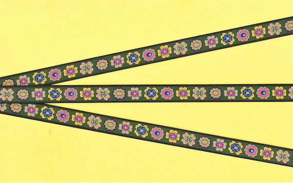FLORAL A-30-S Jacquard Ribbon Poly Trim 3/8" wide (9mm) Yellow w/Hot Pink Borders, Hot Pink & Purple Flowers, Green Leaves